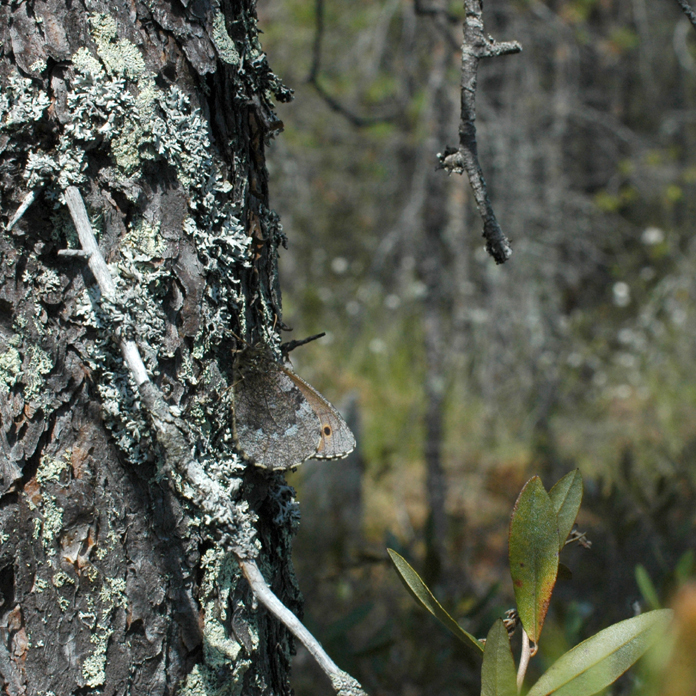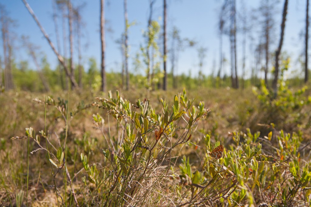 Harvapuiset rämeet ja nevojen reuna-alueet ovat suoperhosten suosimia elinympäristöjä. Täysin avoimilla suotyypeillä perhoslajeja on vähän tai vain satunnaisesti. Suokeltaperhonen lepäämässä vaiveron varrella. Kerimäen Riitasensuo 6/2012, oikealla Hälvänsuo