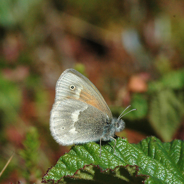 Saraikkoniittysilmä Coenonympha tullia muuraimen lehdellä. Pilvineva, Rautjärvi
