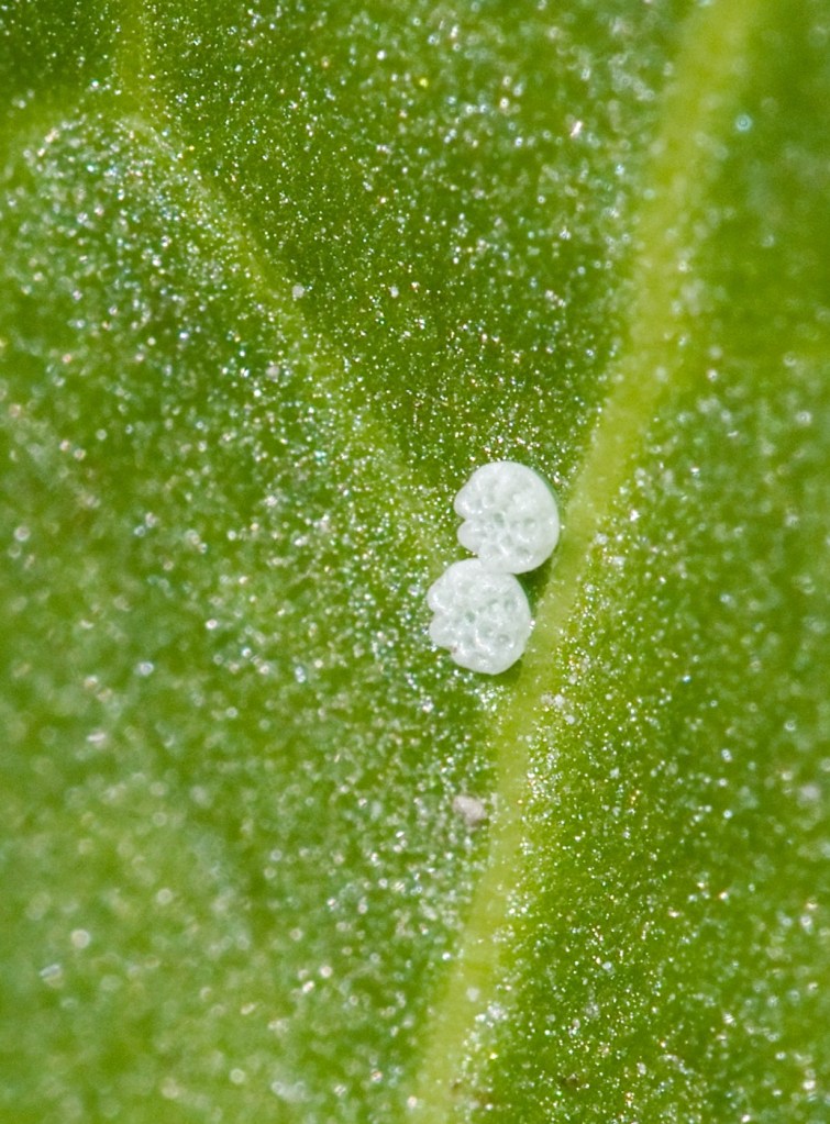 Joutsenossa hakkuun reunamalta isokultasiipi löytyi kahtena peräkkäisenä kesänä. Lautakasan vieressä kasvavalta hevonhierakalta lentoon lähtenyt naaras oli ollut munimassa. Munat erottuvat molemmista yllä olevissa kuvissa.
