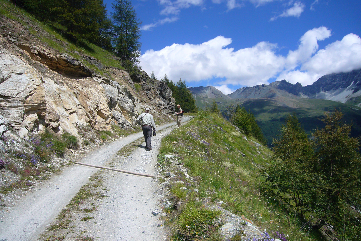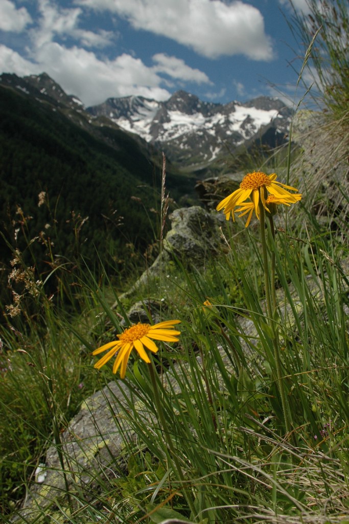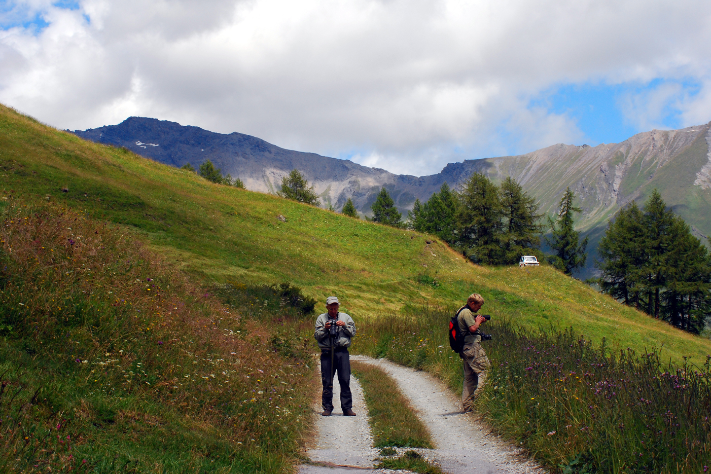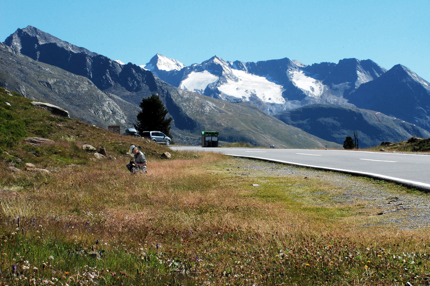 Aamulla ilma oli surkea, sadetta ja kylmää. Ajoimme kohti Söldeniä Itävallan poikki. Italian rajalla serpentiinitiet kiemurtelivat ylös Timmelsjochiin (2474 m). Siellä kulki pitkin vuorenkuvetta noin 1 ½ km pituinen, upea hiekkatie, jota talsimme aamu- ja päiväauringossa. Hienot alppiniityt kukkivat alapuolella.