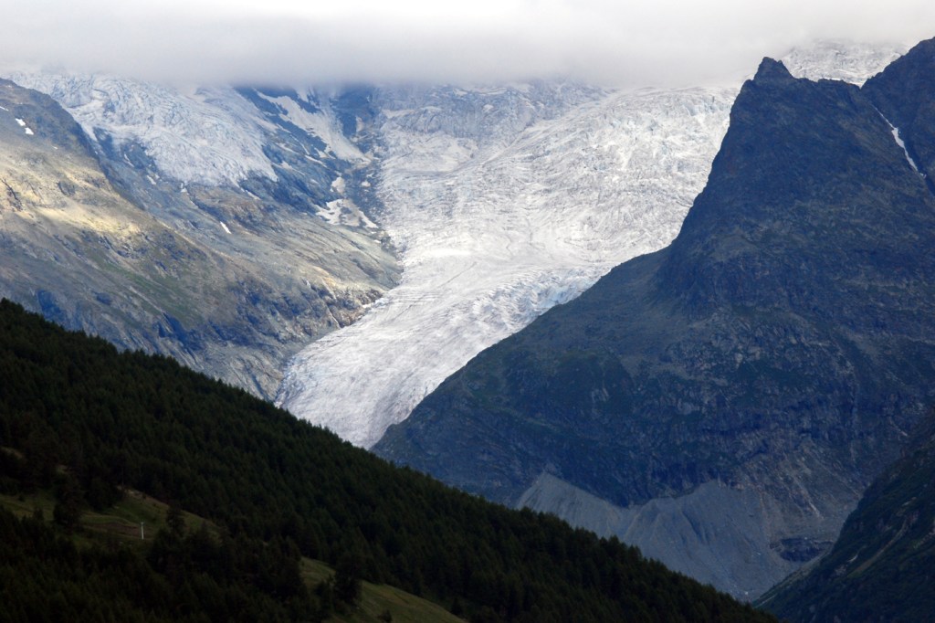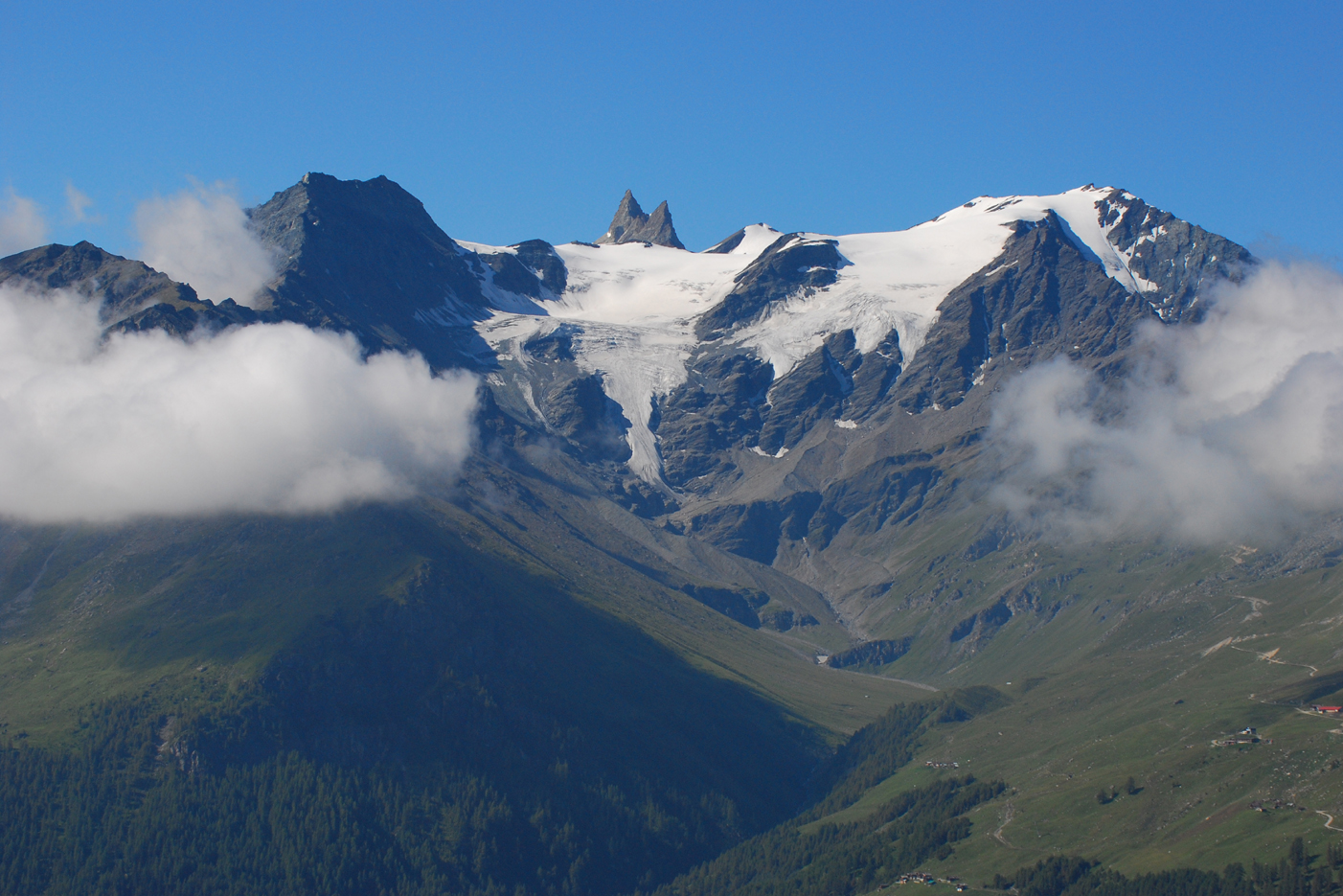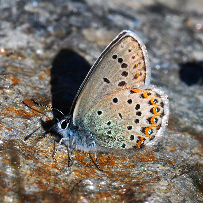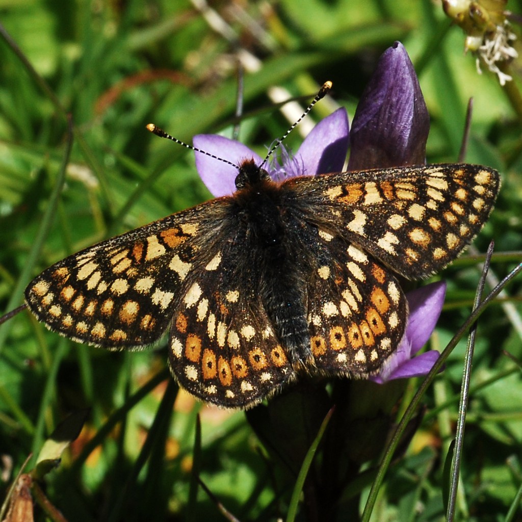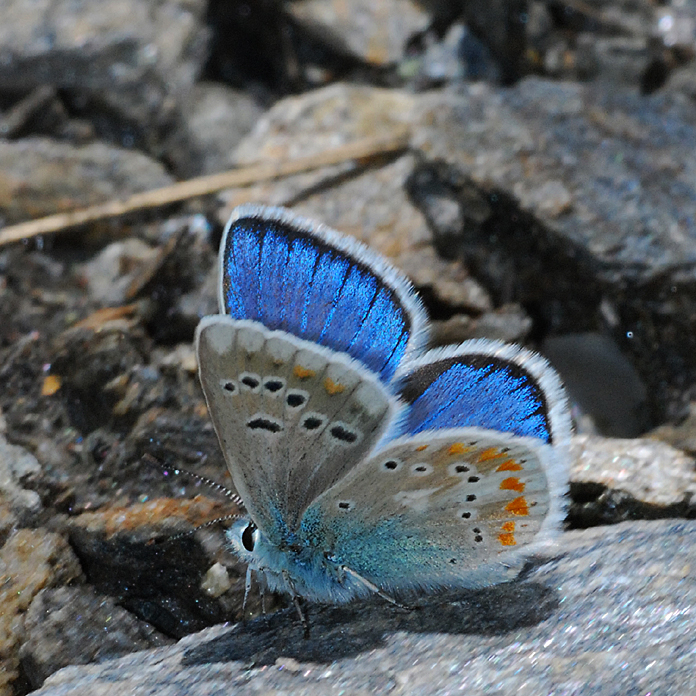 Aamu jälleen täyttä aurinkoa, joka jatkui koko päivän. Ajettiin ensin Saas Feen pikkutietä Rhone-laakson itäpäässä ylös vuorille ja etelään jäätikön alapuolelle. Siellä solisivat iso patojärvi ja jäätikkö suurena tunturivirtana. C. phicomonea ja P. phoebusta lensi melkein huttuna jäätikön alapuolella. Uutena lajina minulle katkerosinisiiven alalaji, P. alcon ssp. rebeli – aivan sattumalta. Hämäävästi tummakultasiipi (L. tityrus) lensi samalla paikalla, sen alalaji (ssp. subalpina).