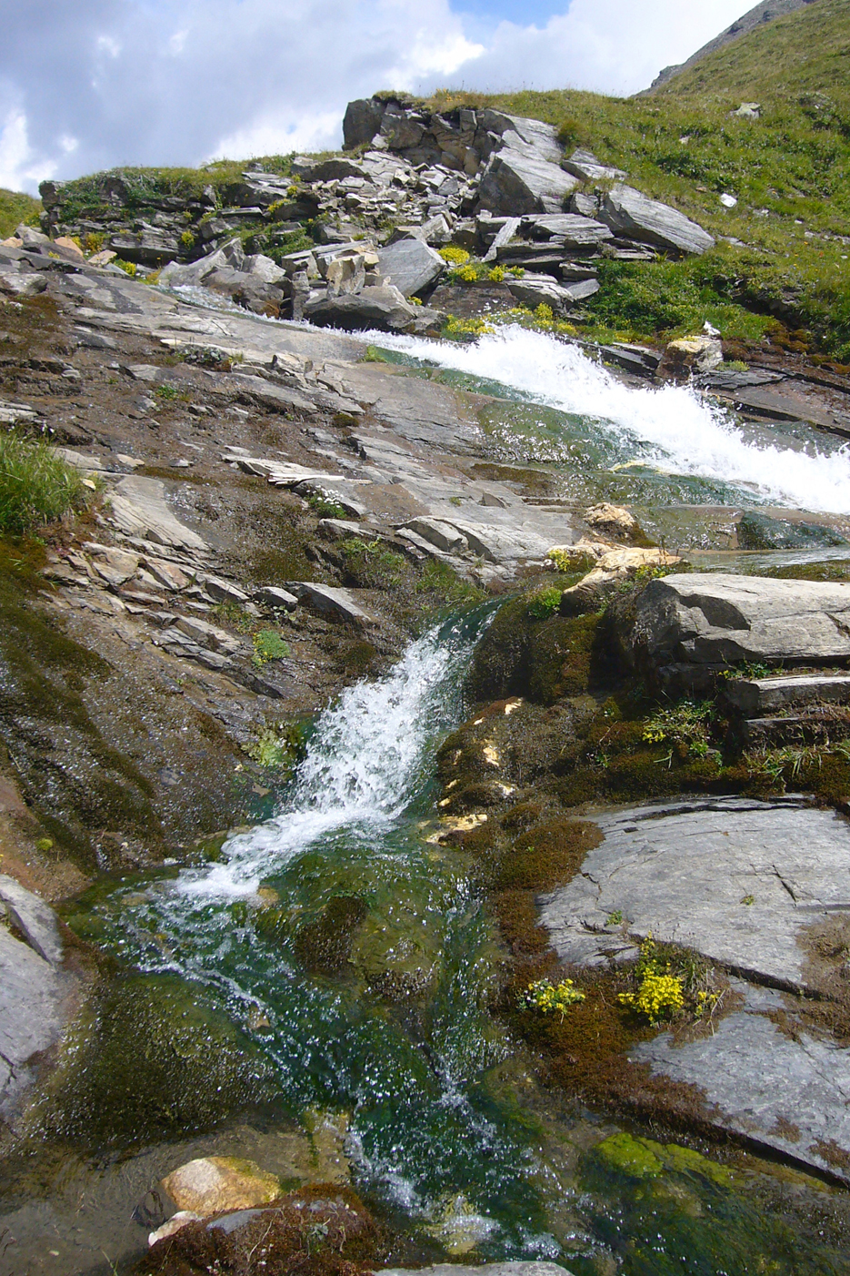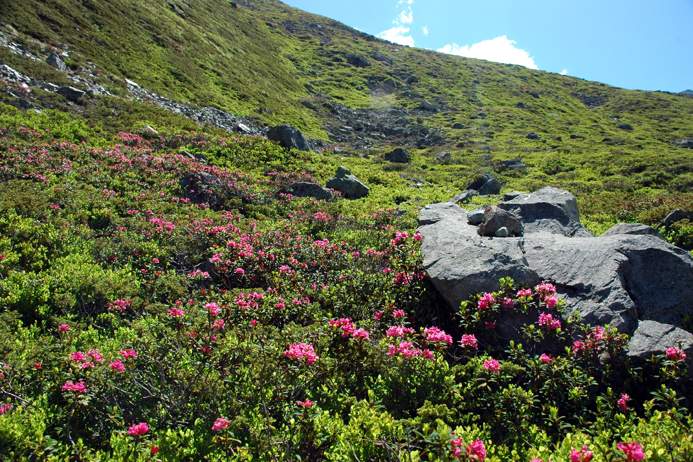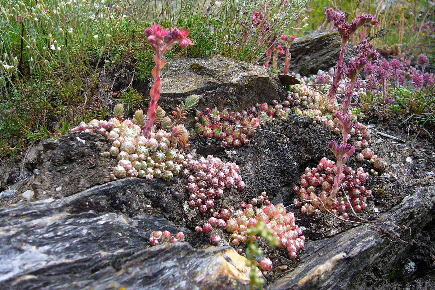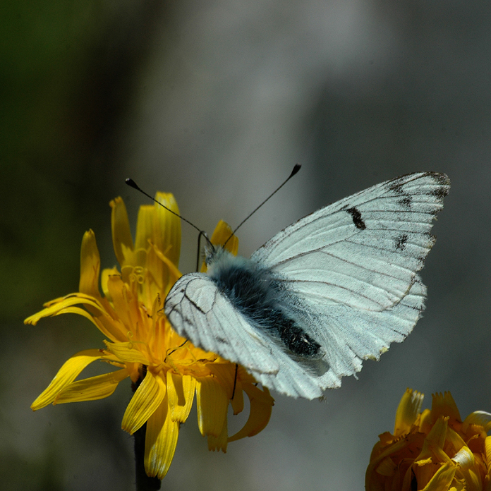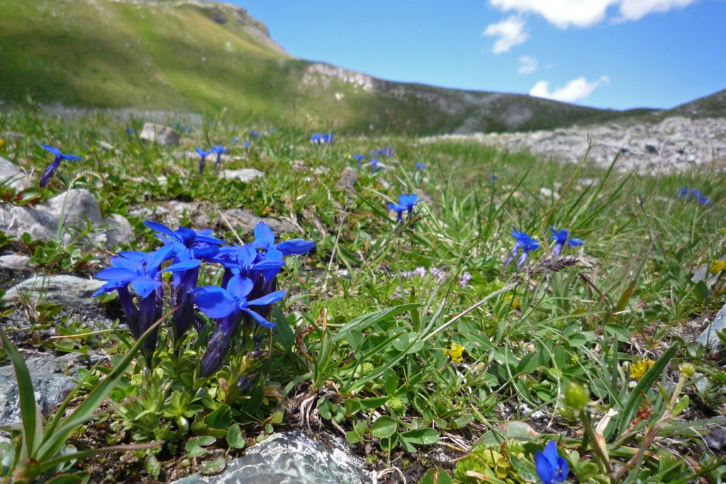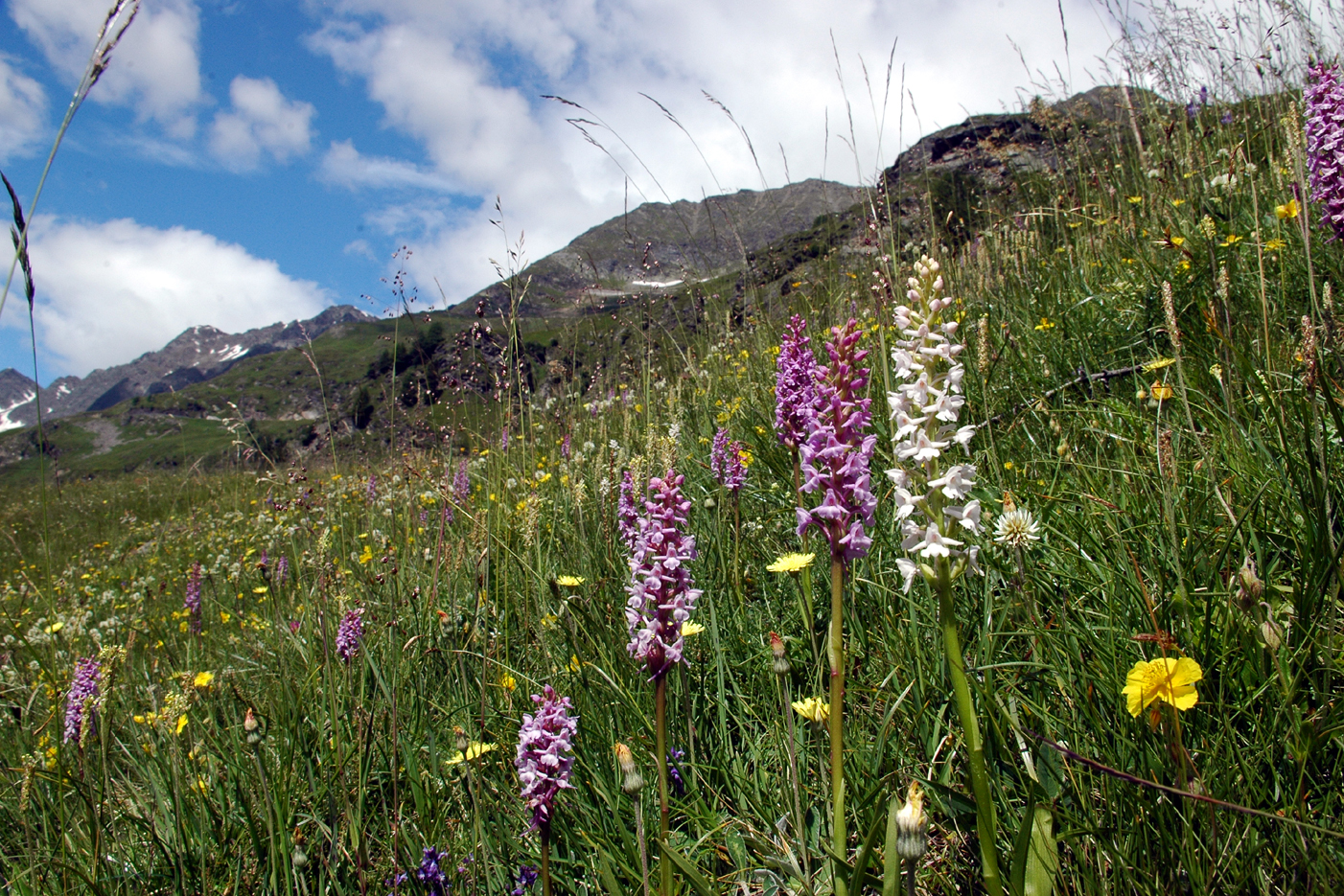 Serpentiinitien mutkissa on paikoin hyviä piennaralueita ja perhosten kuvauspaikkoja 7/2007 TH. Ylinnä oikealla alppisinappiperhonen Pontia callidice 7/2007 HA. Alimpana vasemmalla alppikirjosiipi Pyrgus carlinae 7/2007 HA, alimpana oikealla tummakultasiipi Lycaena tityrus ssp. subalpinus 7/2007 HA