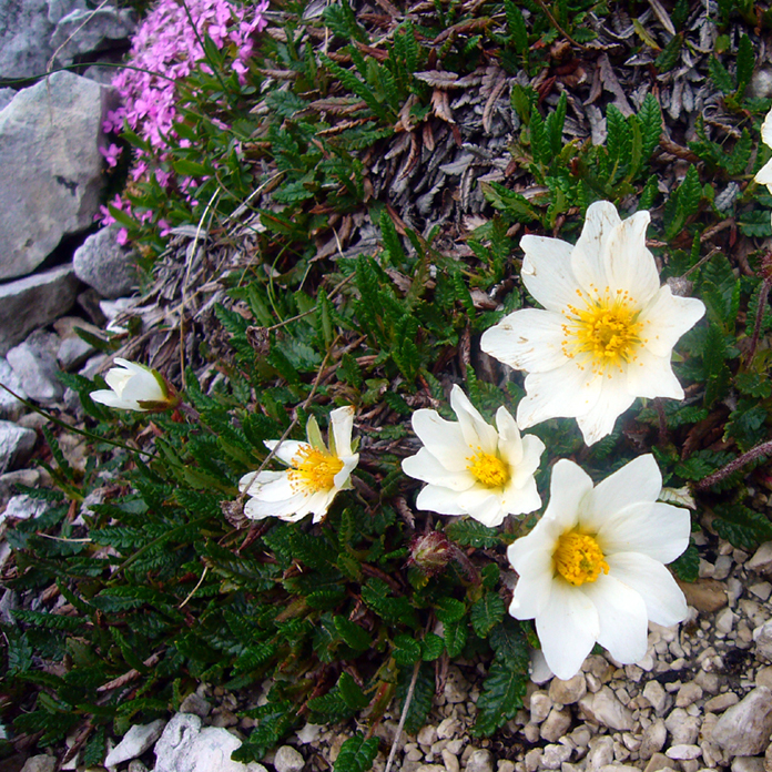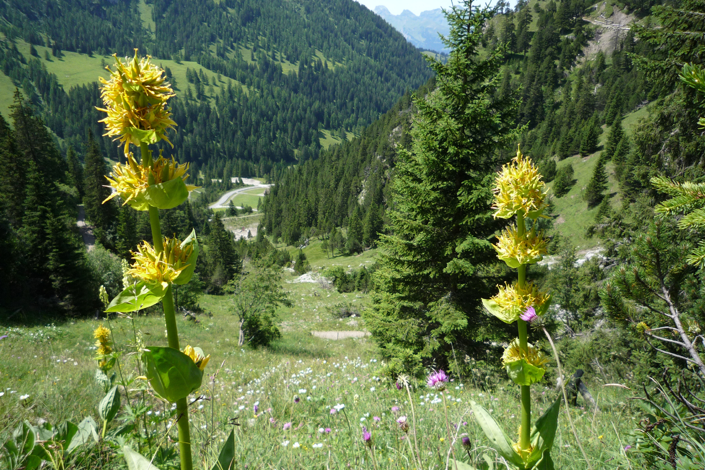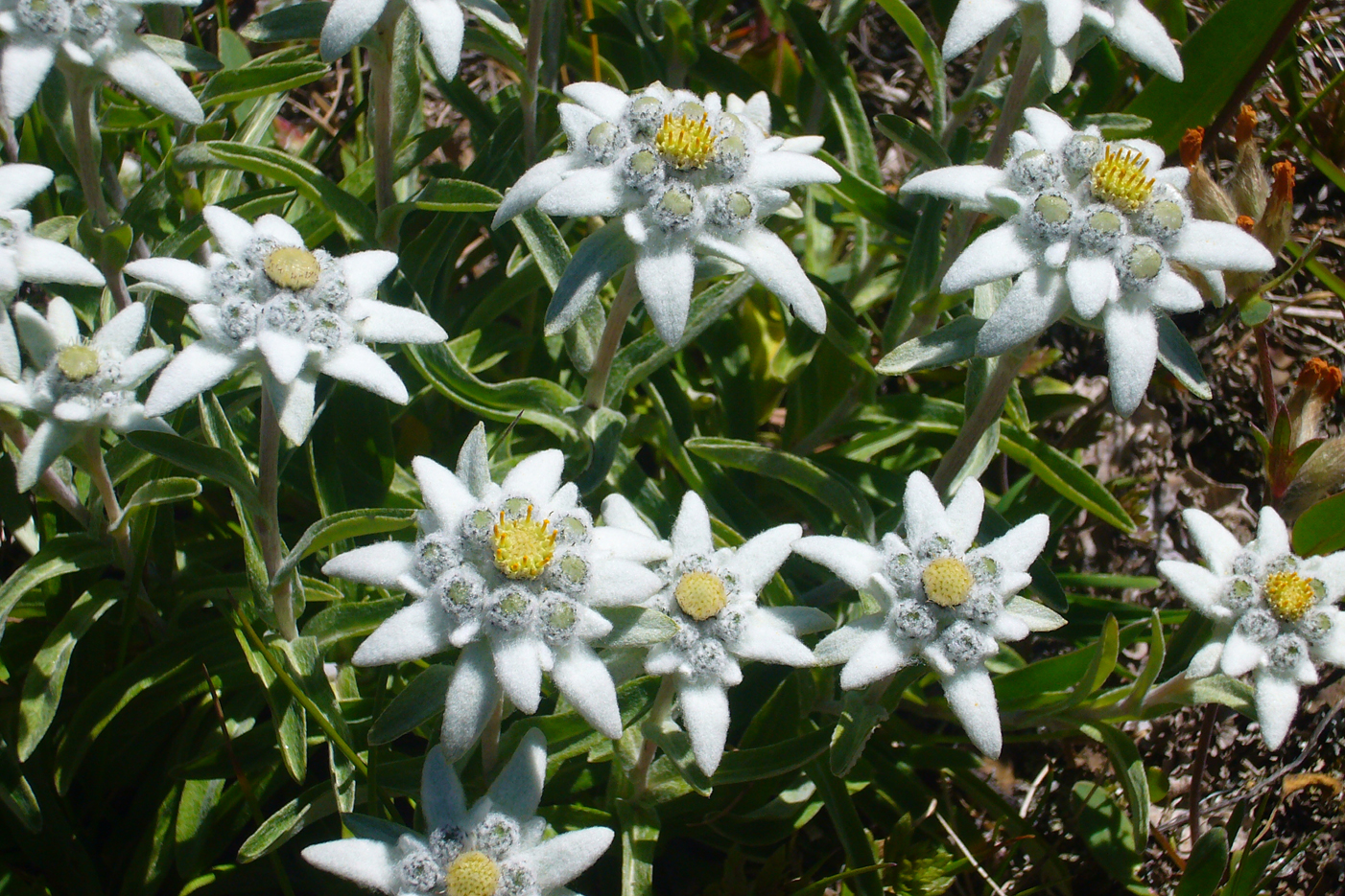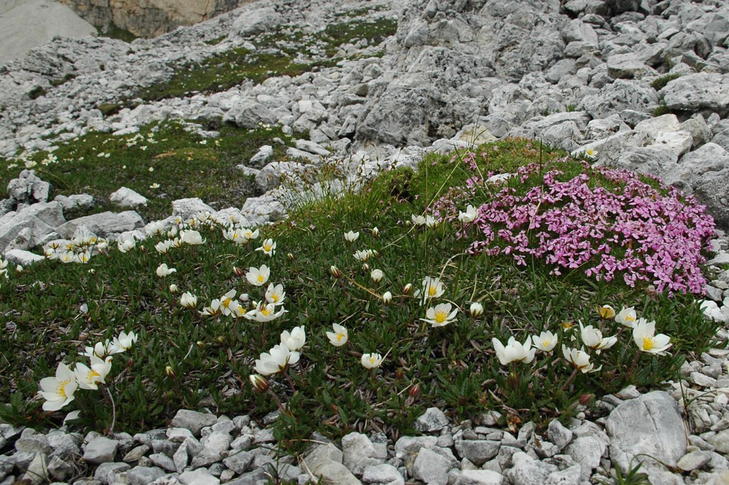 Alppien alueella tavataan yli 4000 putkilokasvilajia, joista merkittävin ja näyttävin osa on puurajan yläpuolella (2400 – 3000m) sijaitsevien alppiniittyjen kukkakasveja. Ylinnä vasemmalla alppiruusu Rhododendron, ylinnä oikealla alppikärhö Clematis alpina ja sen alla alppikatkero Gentiana acaulis. Keskirivissä vasemmalla arnikki Arnica alpina ja aasianverkkoperhonen Euphydryas intermedia, keskellä alppitähti Leontopodium alpinum, oikealla lapinvuokko Dryas octopetala. Alimpana vasemmalla kimalaisorho Ophrys sp., oikealla kevätkatkero Gentiana verna.