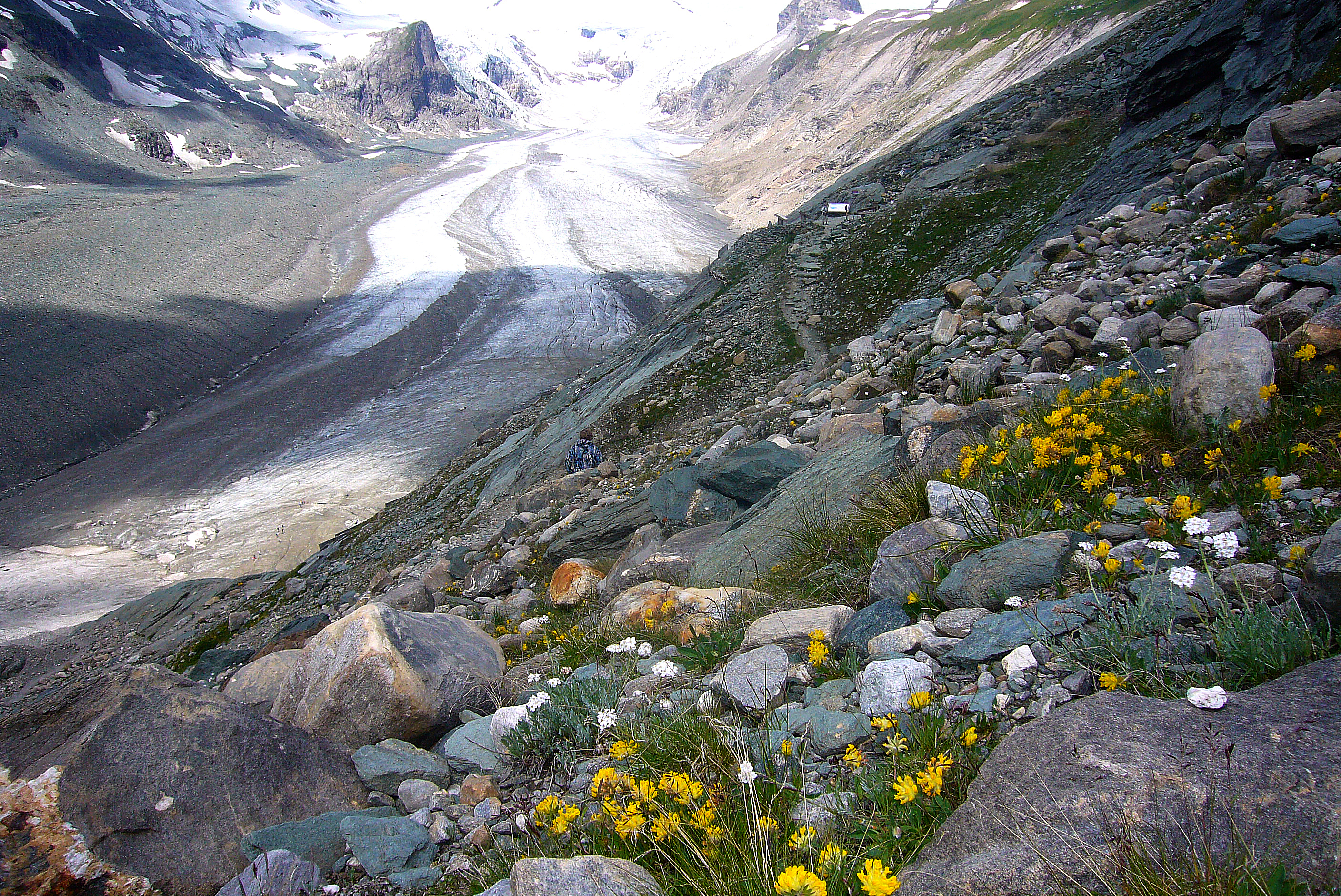 Upea, aurinkoinen päivä. Aamulla entiselle hiekkatielle, jossa edelleen E. tyndarusta ym. mutta paljon vähemmän kuin reilua viikkoa aikaisemmin. Kävelin yläkautta melkein jäätikön alle, jossa vihreä, pieni alppijärvi. Ei enää C. phicomonea, joku P. phoebus, ei P. callidicea – eli perhoset vähentyneet, kun kukkaloistokin jo kuihtunut. Ajuruohot ovat hyvä tuntomerkki – kun ne kulahtavat, perhoset alkavat vähentyä.