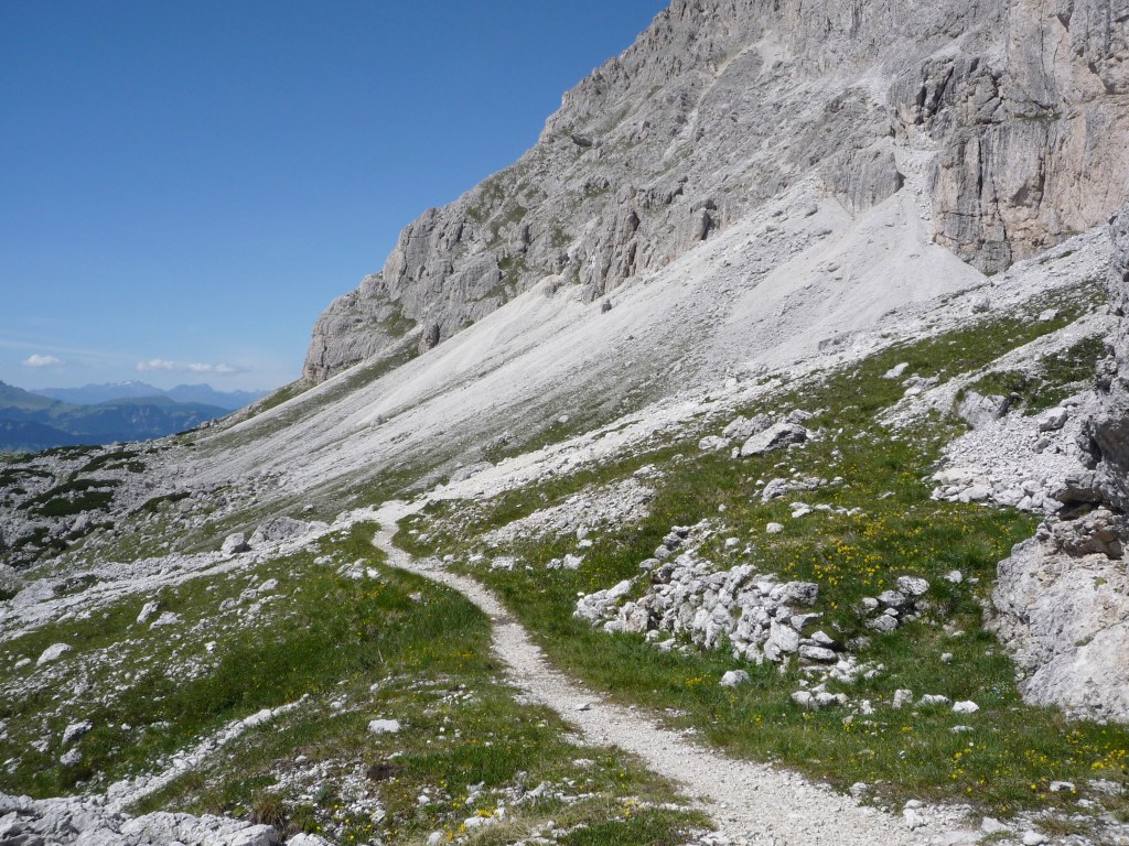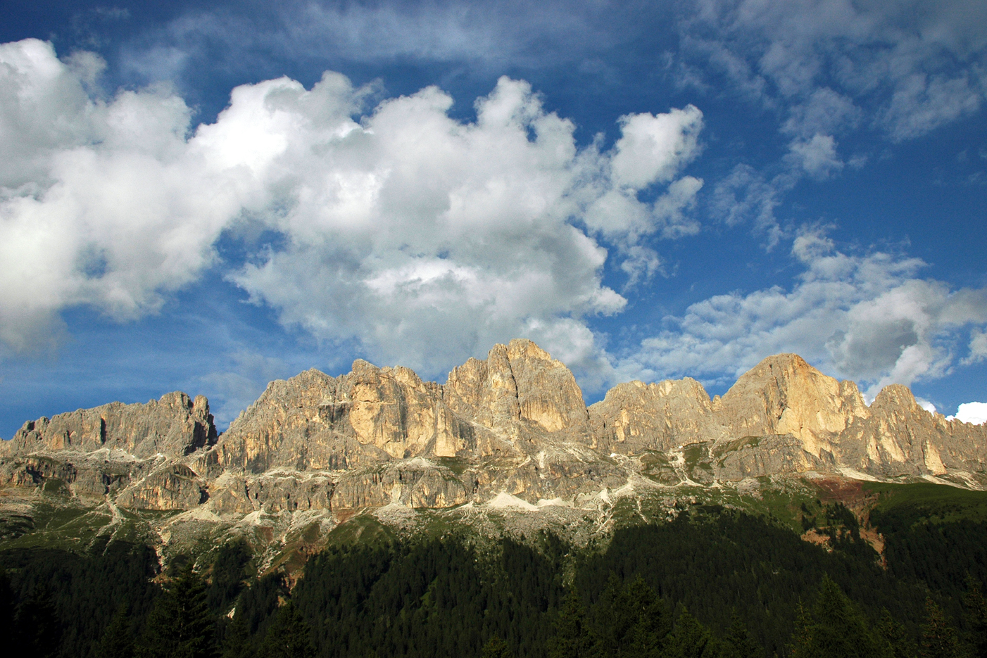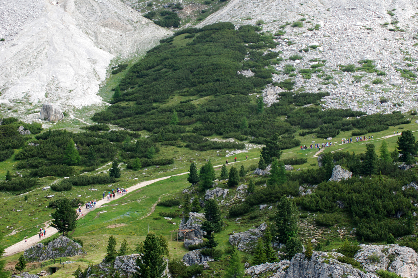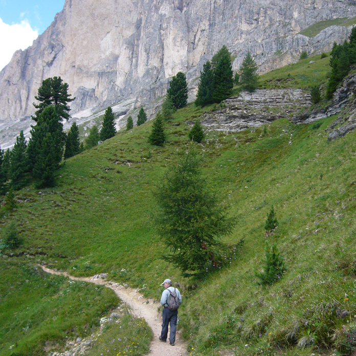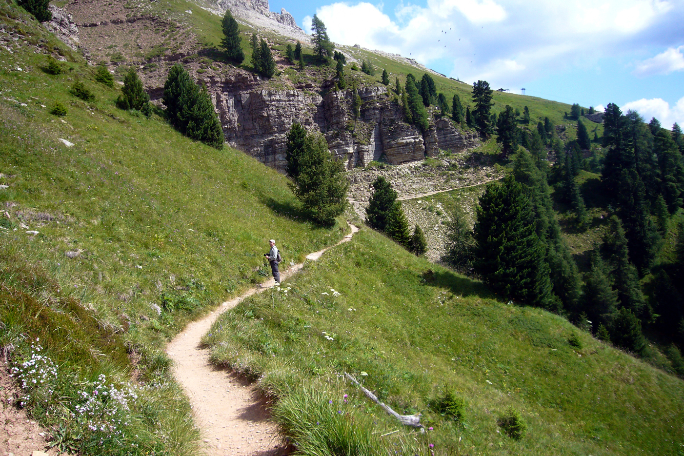 Dolomiitit, loistavan kauniit, valkeat vuoret. Valle di Fassa on ilmeinen keskuspaikka, josta on lähtöä joka suuntaan. Jo edellisenä iltapäivänä osuttiin Rosengartenin hissille ja alppiniittyjen kasvillisuus todella upeaa – siitä nimi! Tärkein osuma P. orbitulus, mutta muuten kasvillisuuden runsauteen nähden melko vähän perhosia. Aurinkoinen iltapäivä ja kuitenkin hieno kävely vuoren kupeessa.