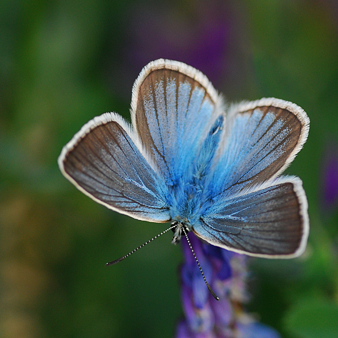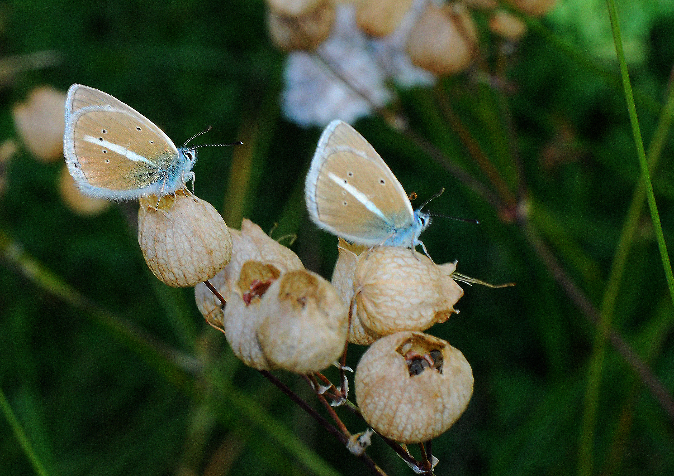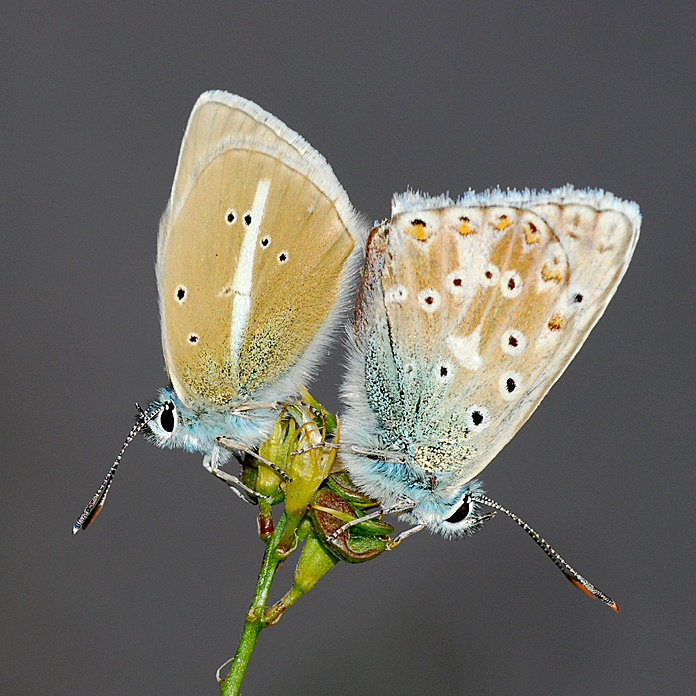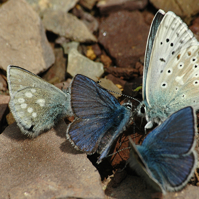 Viirusinisiipi Polyommatus damon, oikealla ylhäällä naaras, alimpana viirusinisiiven parina vihersinisiipi P. coridon 7/2007 HA