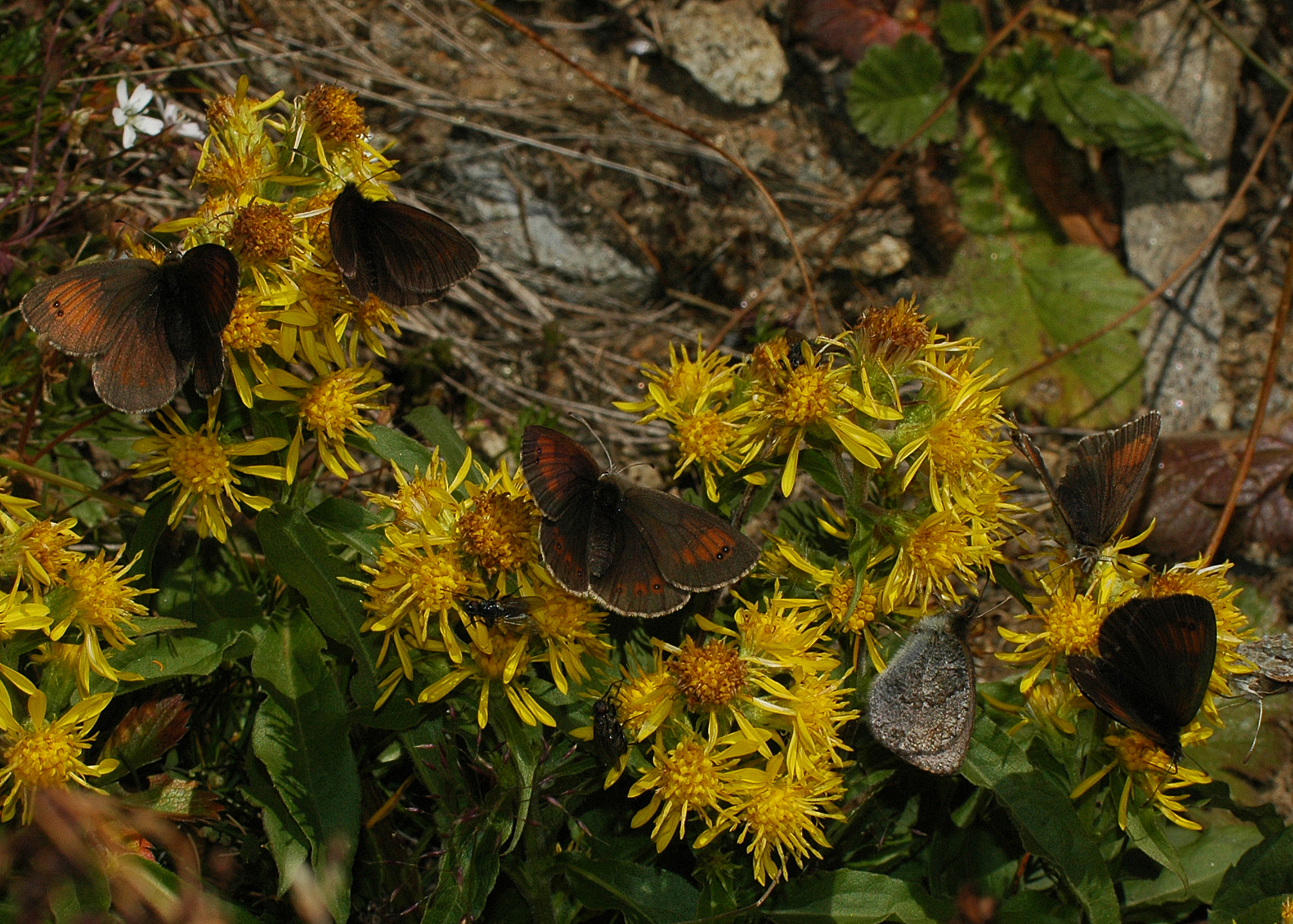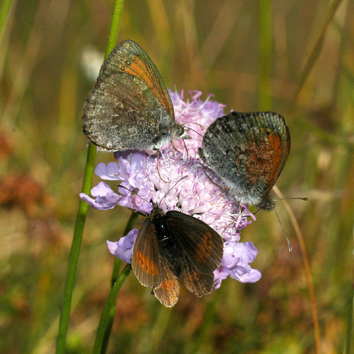 Timmelsjochin Gasthausin lähellä olevilla niityillä elää useita nokiperhoslajeja. Ylimpänä oikealla mantelinokiperhonen Erebia alberganus 6/2008 HA, alimpana rengasnokiperhonen E. medusa 6/2007 HA