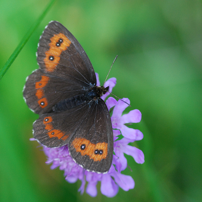 Joskus kuvattava kohde yllättää kuvaajan ja pyrkii liiankin lähelle. Skotlanninnokiperhonen Erebia aethiops 8/2007 TH/PO