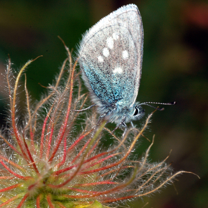Luonnon muovaama perhospuutarha Sveitsin Alpeilla Evolenessa. Vuorihohtosinisiiven Polyommatus eros elinympäristö. Ylimpänä oikealla koiraita, alinna naaraita 7/2007 HA/TH