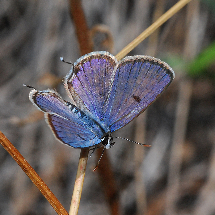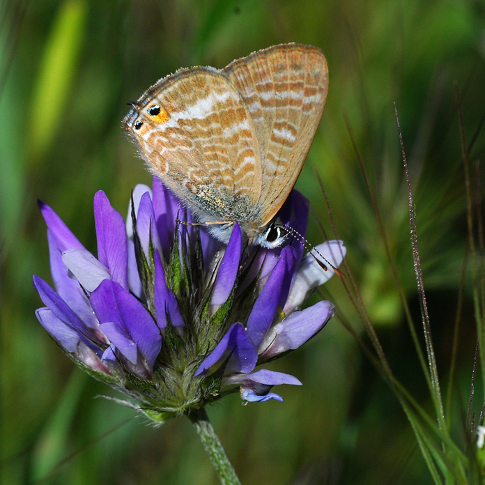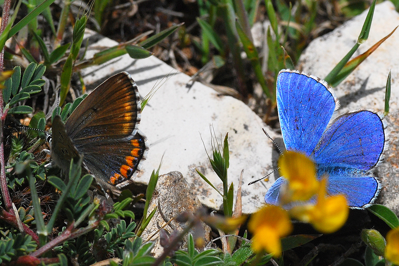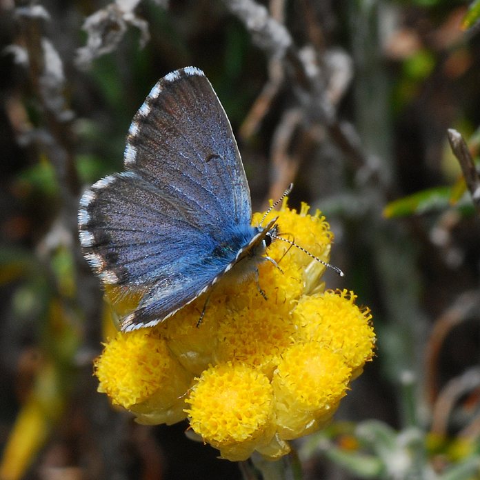 Ylhäällä: Iberianharjusinisiipi Pseudophilotes abencerragus 5/2008 HA, alhaalla: vaellussinisiipi Lampides boeticus 5/2008 HA