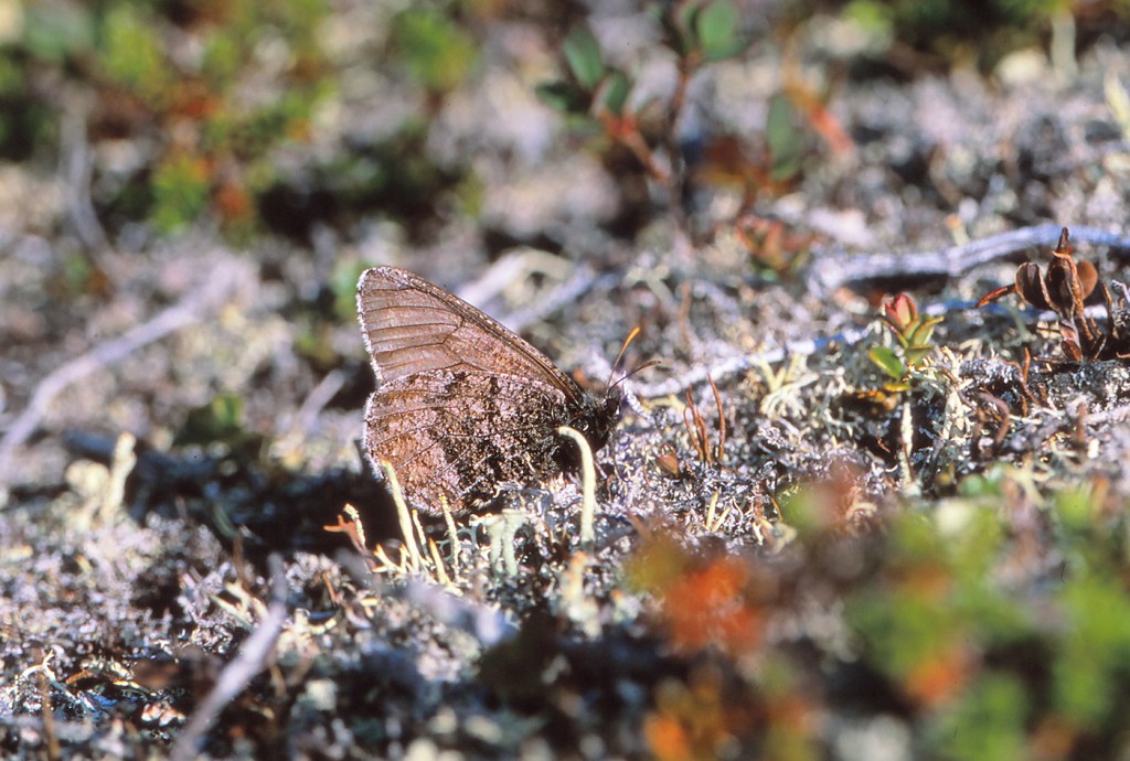 Maanantai 6.7. Aamulla kolme tuntia täyttä aurinkoa kuudesta yhdeksään, mutta nukutaan pitkän ajomatkan päälle. Pahus. Ailigastunturille pääsee laiska autolla pitkin tietä! Pilvistä ja helvetin kylmää. Ylhäältä kiviseltä laelta löytyy yksi paljakkakylmäperhonen, joka lennähtää jaloista. Se on niin kohmeessa, että kuvaaminen on helppoa. Hyvä suojaväri. Ilmeisesti perhonen lentää auringossa lujaa maata viistäen ja pudottautuu varvikkoon niin, että sitä ei tahdo huomata edes muutaman kymmenen sentin päästä. Muita perhosia ei ole. Eikä ihme. Miten täällä aukealla ja armottoman tuulisella laella voi perhonen elää?
