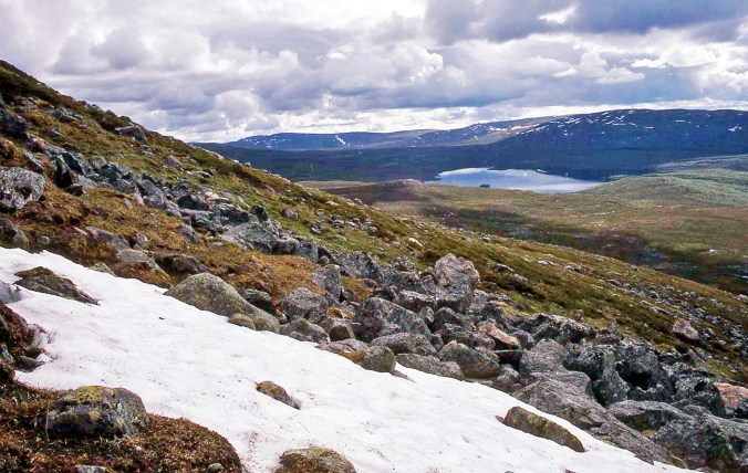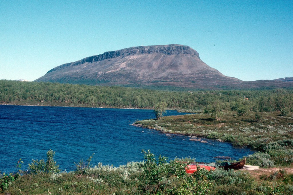”Jos sattuu olemaan jo myöhäinen ilta, ensimmäinen vaikutelma on juhlallisen synkkä, miltei karmea. Kesäyön aurinkoisilta vuorilta laskeudutaan kuin varjoisaan manalan rotkoon, kuin kylmään jääkellariin. Jos on juhannuksen aika, jäät ovat vasta lähteneet, niitä ajelehtii vielä rannoilla. Koivu on hiirenkorvalla, lumi peittää pohjanpuoleisia rinteitä.” Reino Kalliola (1958) lähestyi Kilpisjärveä samaa ainoaa tietä, mitä mekin.