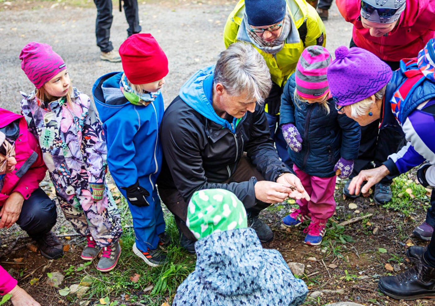 Jantunen kääntää suuren kiven. Maaperästä paljastuu melkoinen vilinä. Yleensä kivien alla viihtyvät tuhatjalkaiset, siirat ja kovakuoriaiset. Muutkin kääntelevät kiviä. Se onkin hyvä keino saada kosketusta maaperän mikrobeihin.
