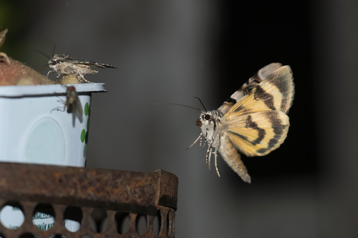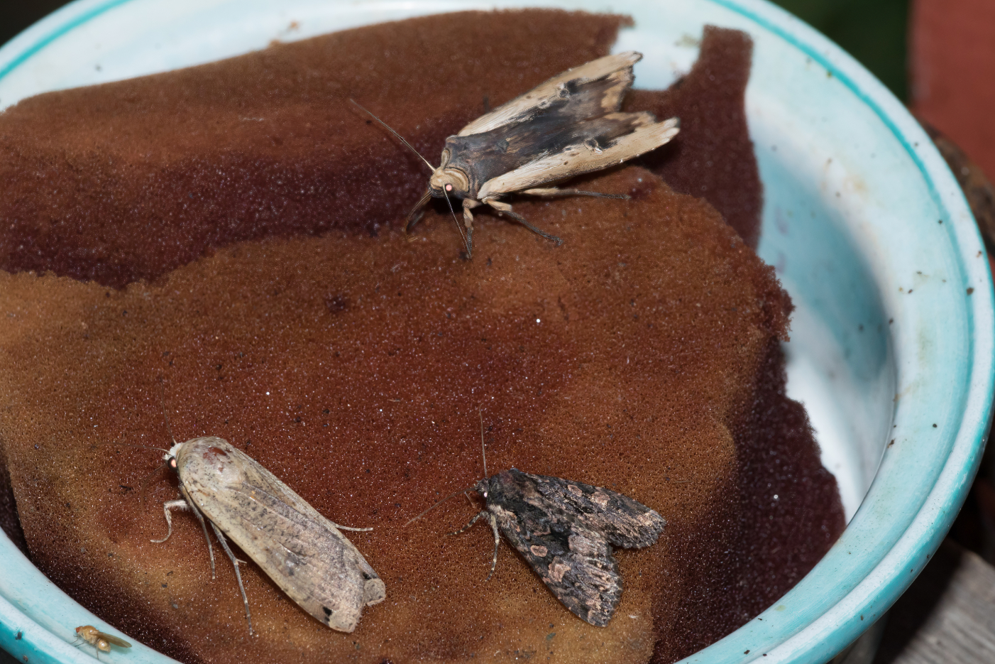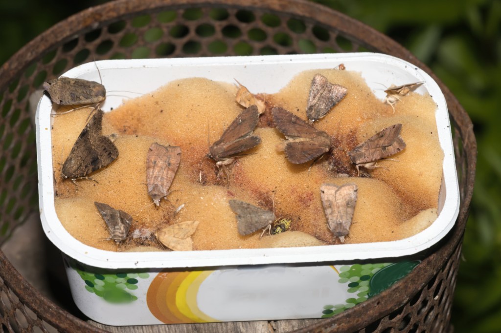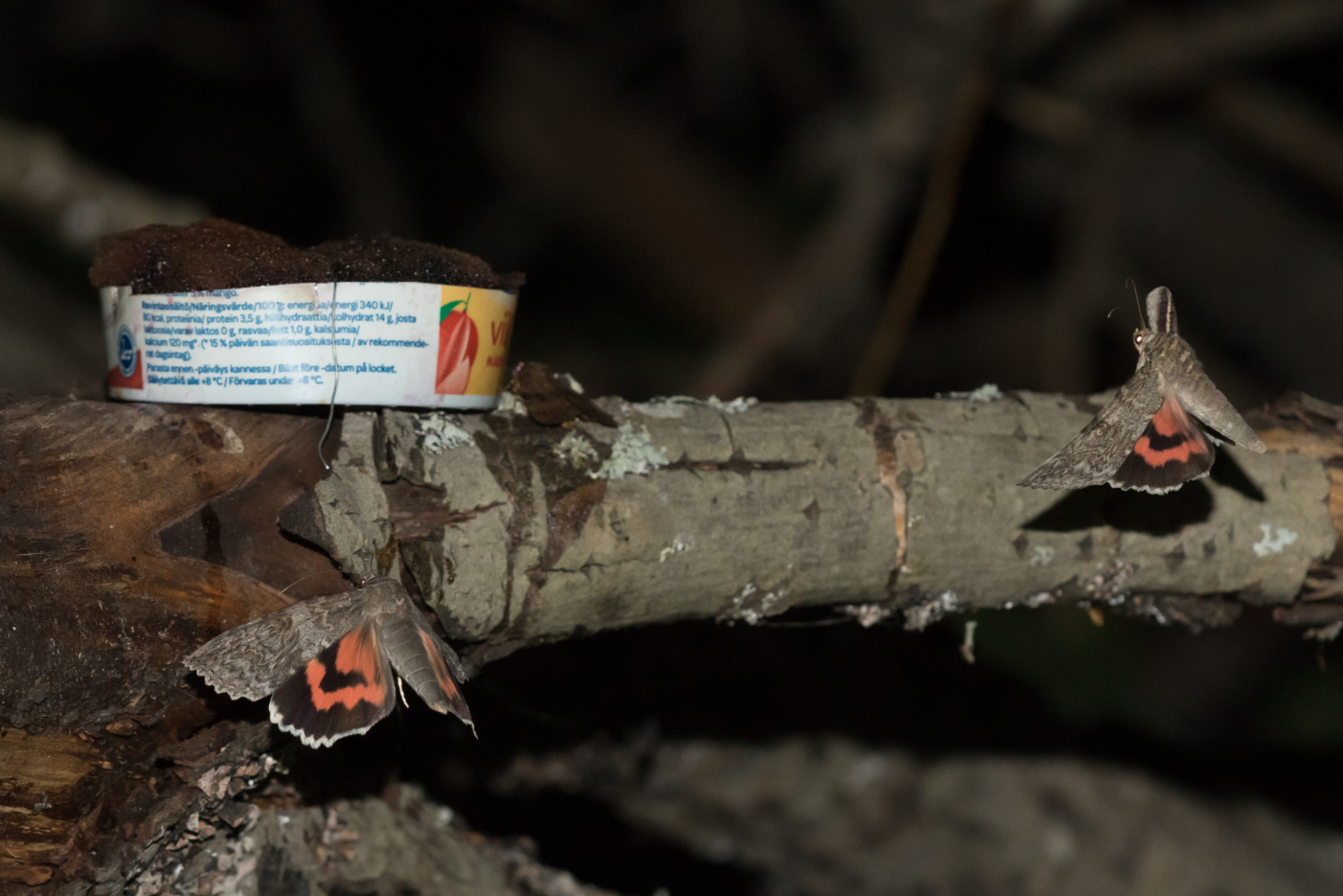 Syöttinestettä voi lorauttaa esimerkiksi voirasiaan tai jugurttipurkkiin tungetulle huokoiselle kangaspalalle tai pesusienelle, jonka päällä perhosten on helppo liikkua ja imeä houkuttavaa lientä. Suurin osa yöbaarin vieraista on erilaisia yökkösiä, kuvassa muun muassa vasemmalla isokokoinen hämypensasyökkönen, keskellä kaksi repoyökköstä ja siellä täällä pilkkuruuniyökkösiä.