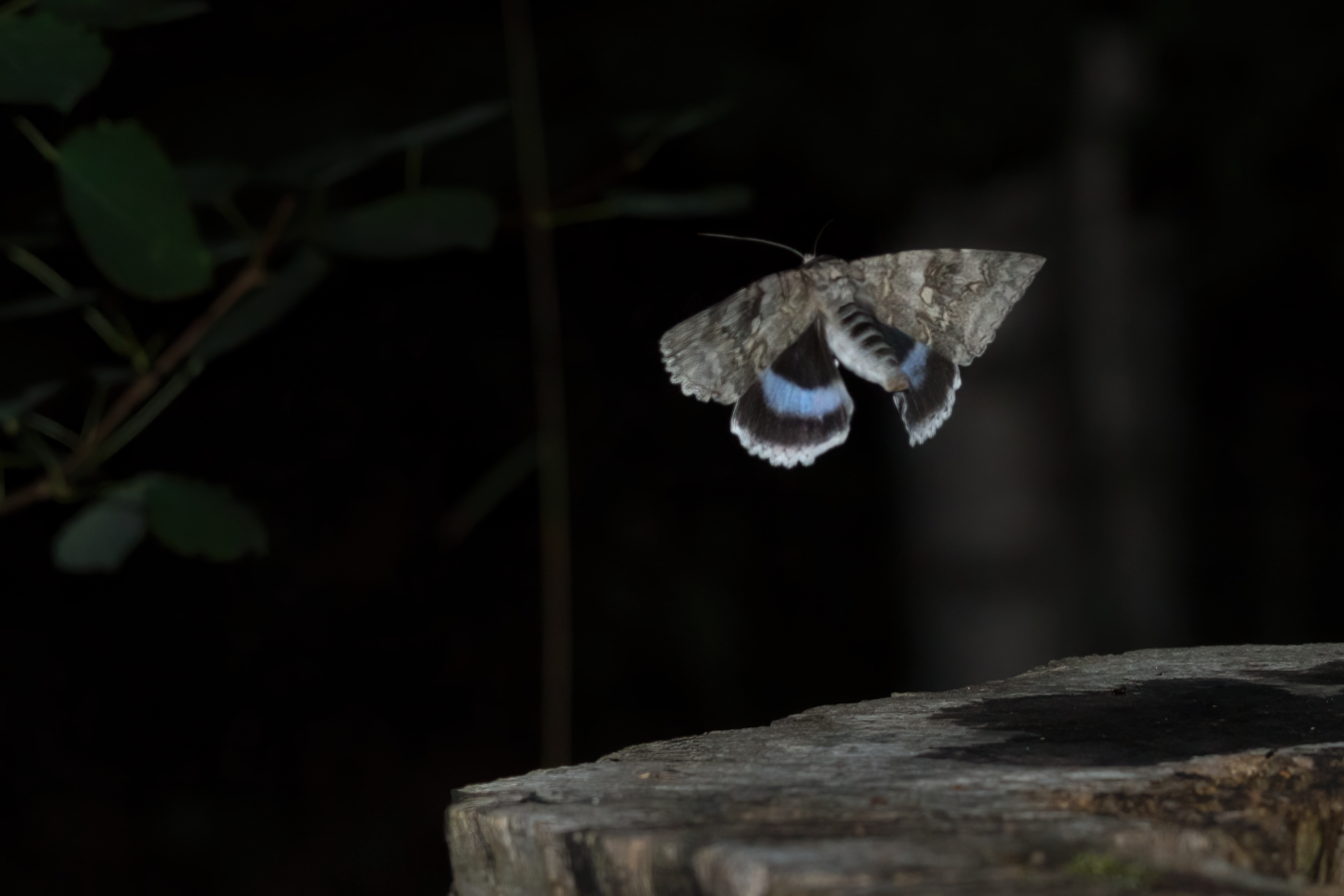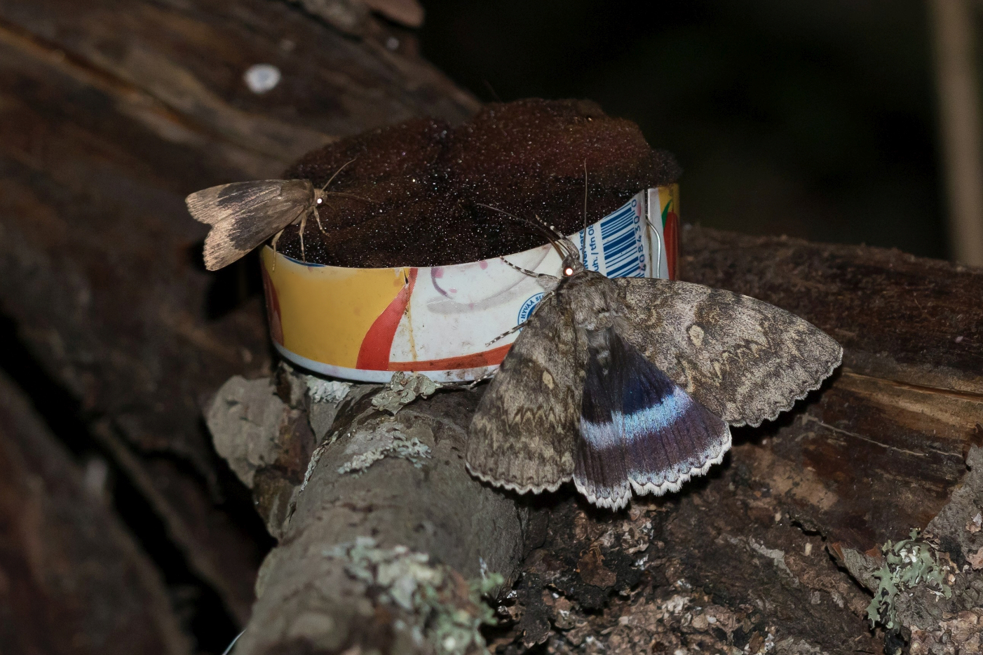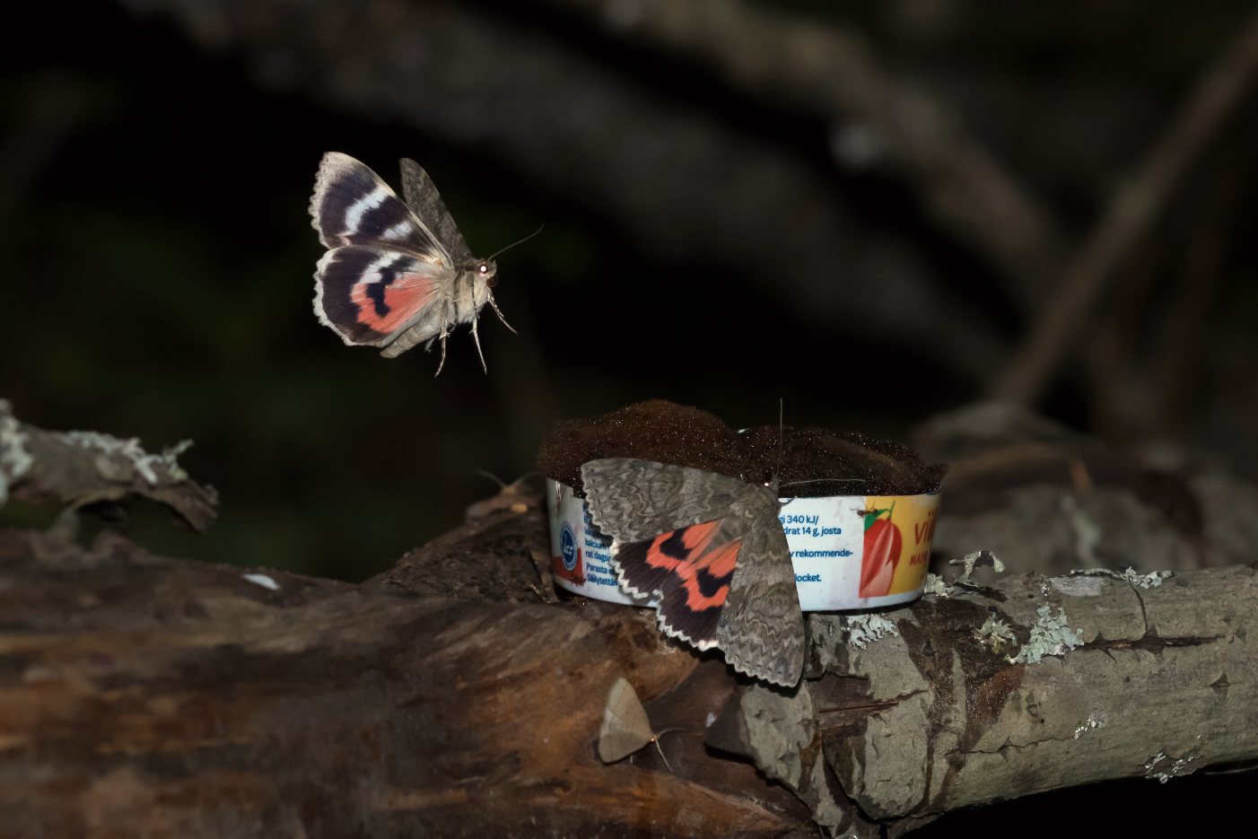 Ylhäällä lennossa kulmaritariyökkönen, siniritariyökkönen ja huppukeltayökkönen. Syötillä kulmaritariyökkösiä.