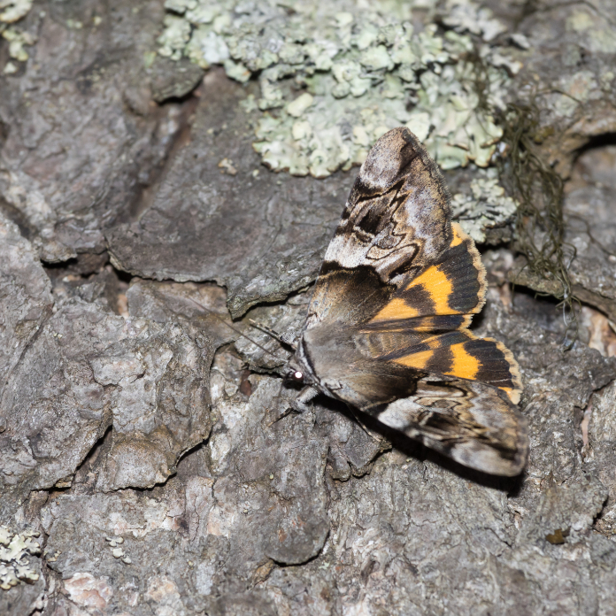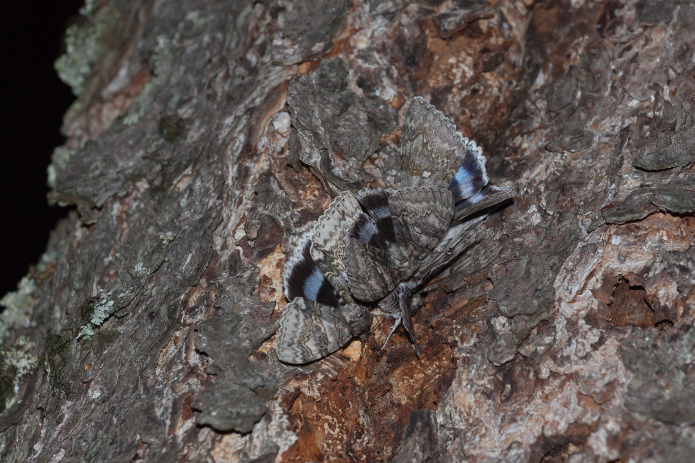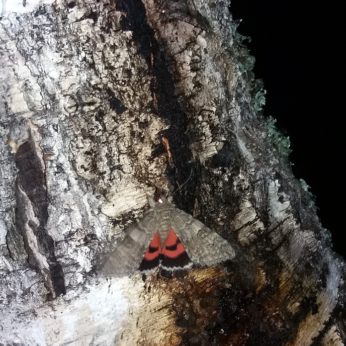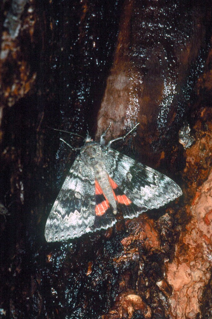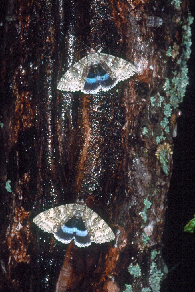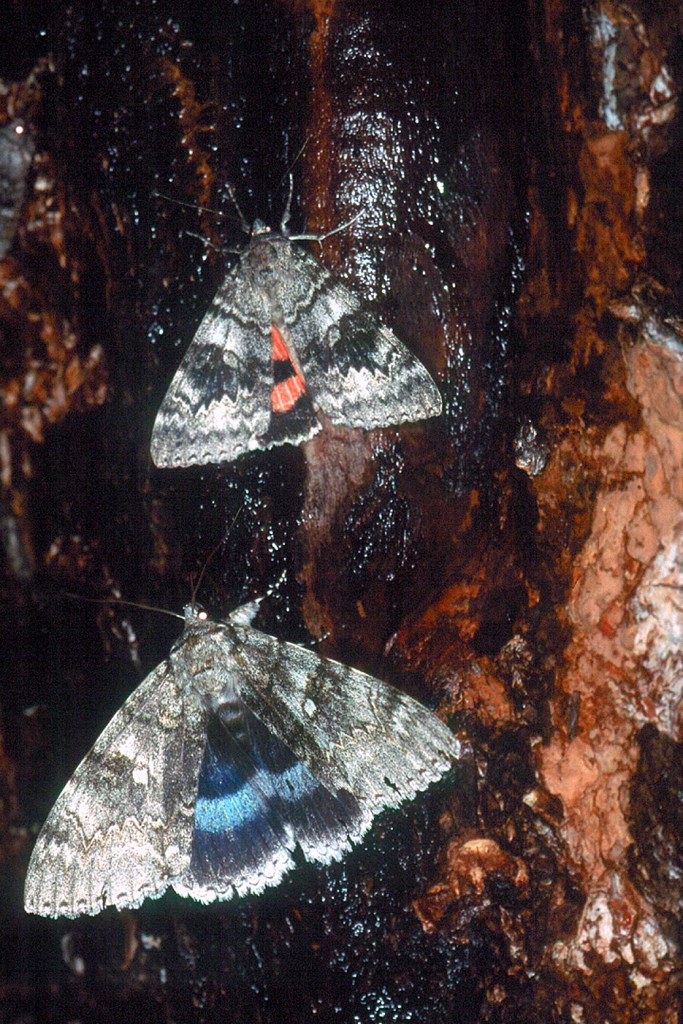 Vaurioituneen tervalepän rungosta valuva neste on houkutellut paikalle ritariyökkösiä. Kuvassa vasemmalla siniritariyökkösiä, oikealla ylhäällä keltaritariyökkönen, oikealla alhaalla kulmaritariyökkönen