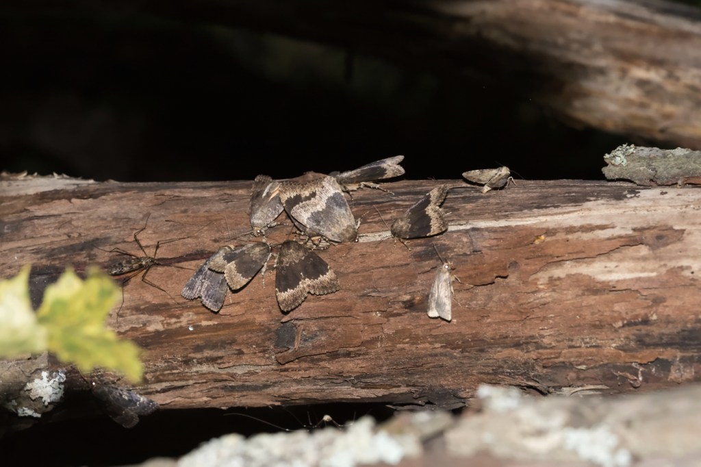 Syöttinesteelle hakeutuvia yökkösiä. Ylhäällä vasemmalla kulmaritariyökkönen, oikealla ruskohirsiyökkönen ja sen seurassa isomorsiusyökkönen ja syysruskoyökkönen. Alhaalla keltaritariyökkönen lennossa.
