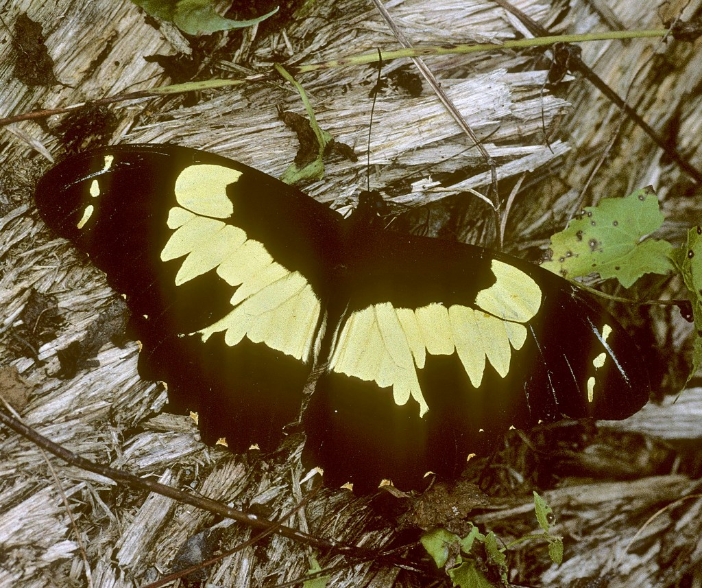 Se on Papilionidi, ritariperhonen, lintusiipi, pikemmin kulmikkaampi Troides kuin pitkäsiipinen Ornithoptera, mutta kannukset kuin hunnut tai hännät.