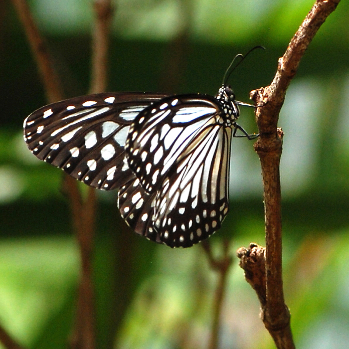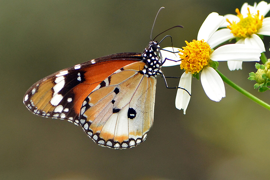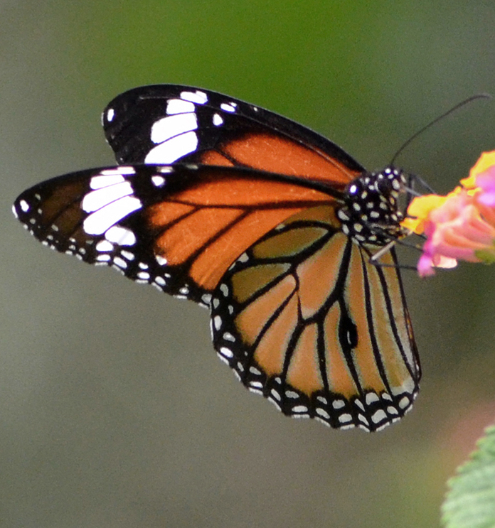 Siinä heti Sanam Luangin rautaportin pielessä lentelee neljä viisi monarkkia. Voiko uuden maailman perhonen olla täällä? Mutta onhan se levinnyt Aasiaan ja Orienttiin, vai onko ehkä matkija eli valemonarkki? Siipisuonet niin vahvat ja valkoiset täplät siivenreunassa niin selvät, että varmasti kuuluu danaideihin, monarkkiperhosiin, mutta taitaa olla kirjomonarkki. Liian tavallisia, vaikka kauniita ja vahvoja, pitkien matkojen lentäjiä. Etusiipien valkoiset kuviot ovat säkenöivästi rivissä. Siitä on voinut saada ideaa.