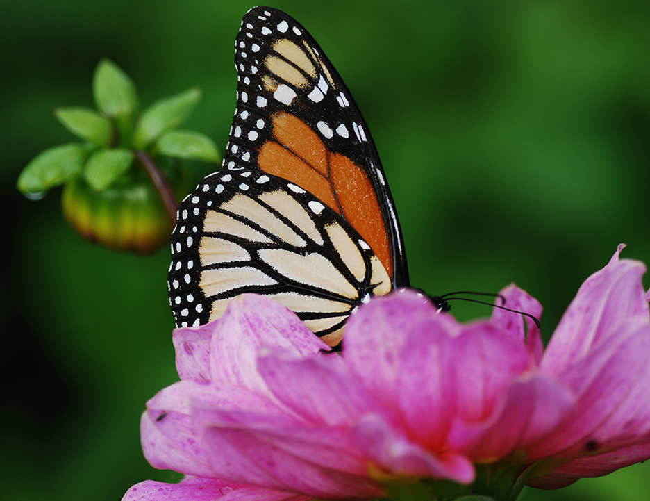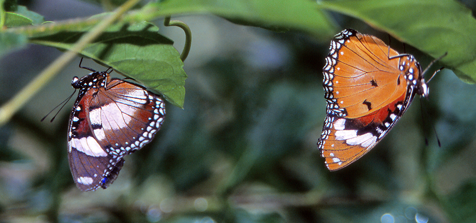 Monarkki, Monarch (Danaus plexippus), kirjomonarkki, Orange Tiger (D. genutia) ja silomonarkki, Plain Tiger (D. chrysippus). Viimeisenä valemonarkki, False Plain Tiger, naaras ja koiras (Hypolimnas misippus).