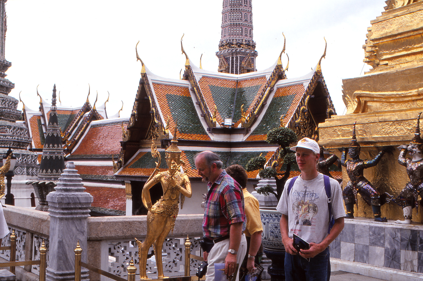 Suuri palatsi ja Wat Phra Kaeo eli smargadi-Buddhan temppeli kimaltelevat Bangkokin liikennesaasteiden himmentämässä auringonvalossa. Lehtikultaiset tornit suippenevat taivaaseen. Marmoriterassilla tanssivat lasinpalasilla päällystetyt elefantit.