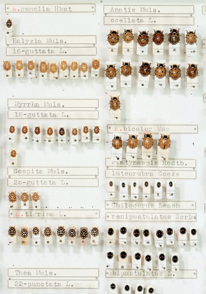 Näytteitä Gunnar Blomqvistin kokoelmasta. Vasemmalla ylhäällä kaksi monipistehaapsasta, vieressä leppäpirkkoja, alhaalla syyslantiaisia ja kaksi viherjalokuoriaista. (Kuvat Juha Jantunen)