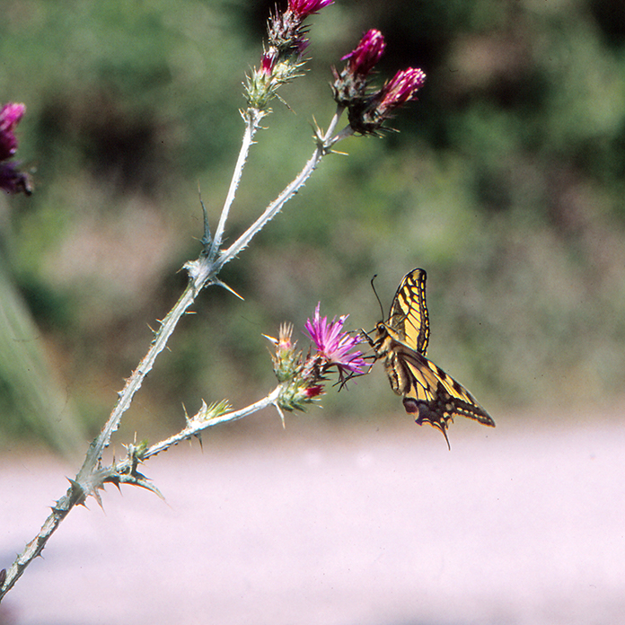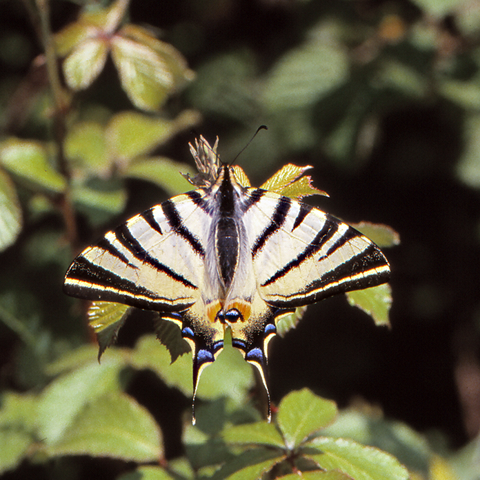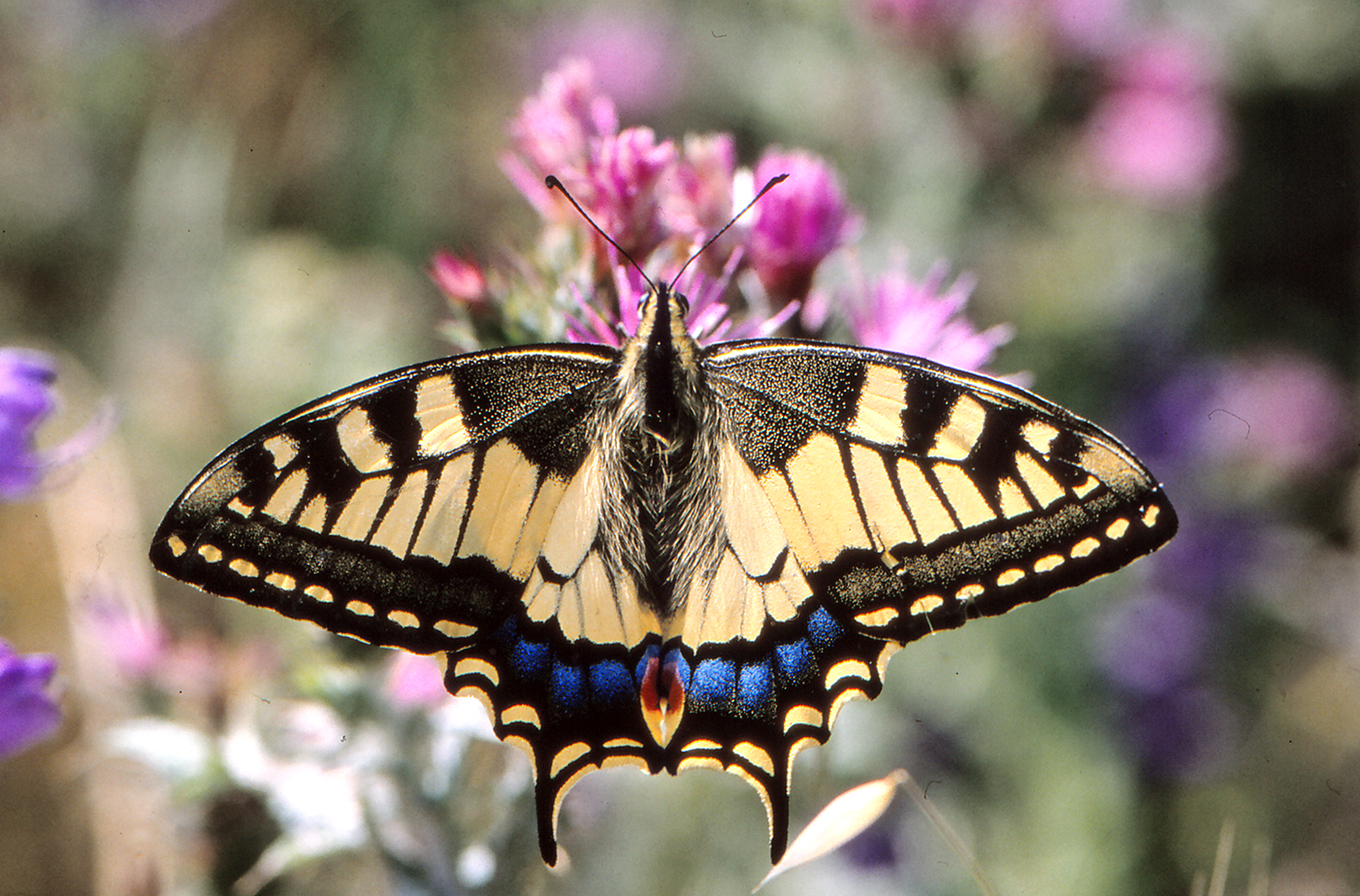 Purjeritariperhonen (Iphiclides podalirius) ja ritariperhonen (Papilio machaon) pyörivät Mon Reposin puutarhassa.