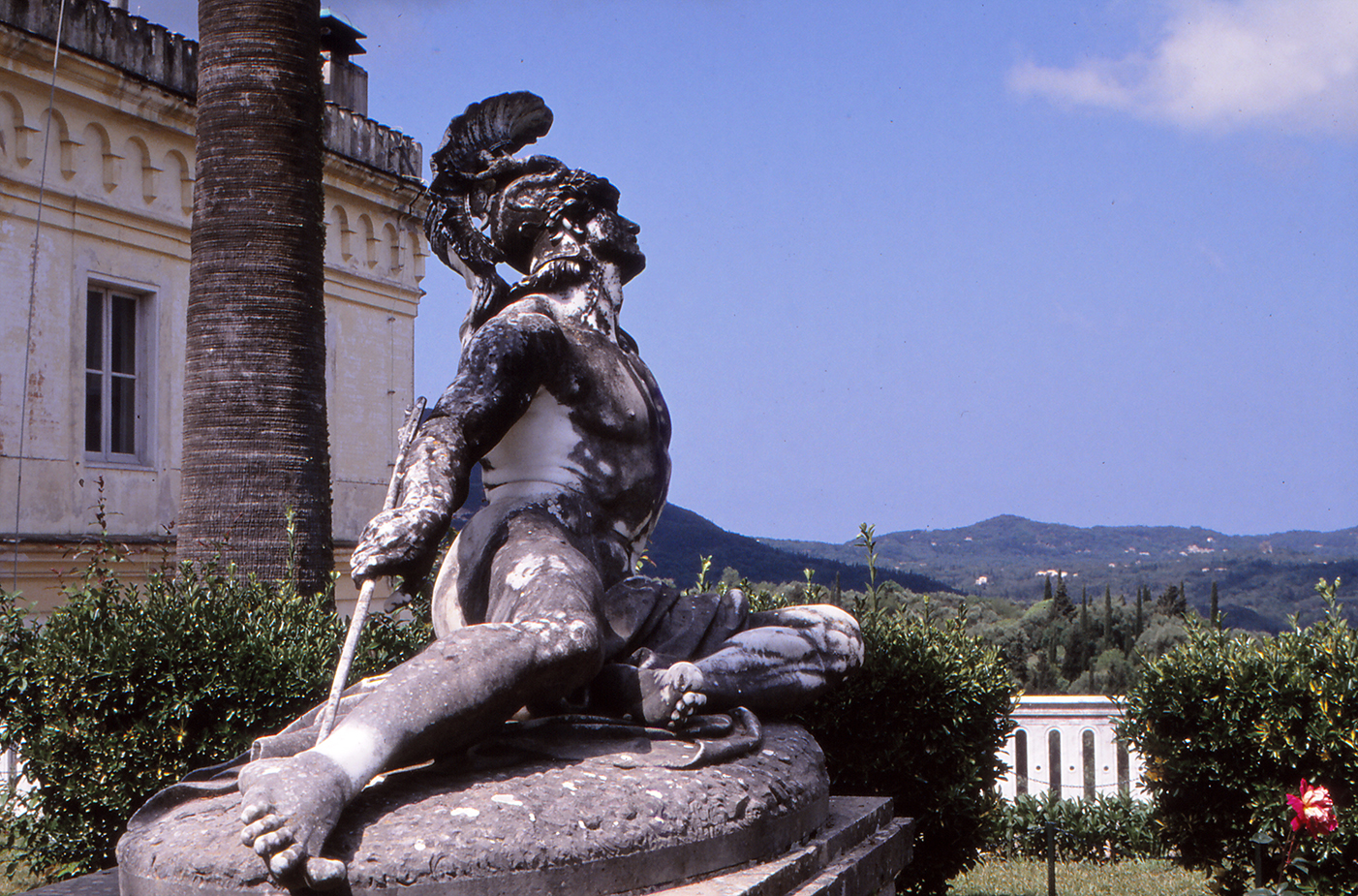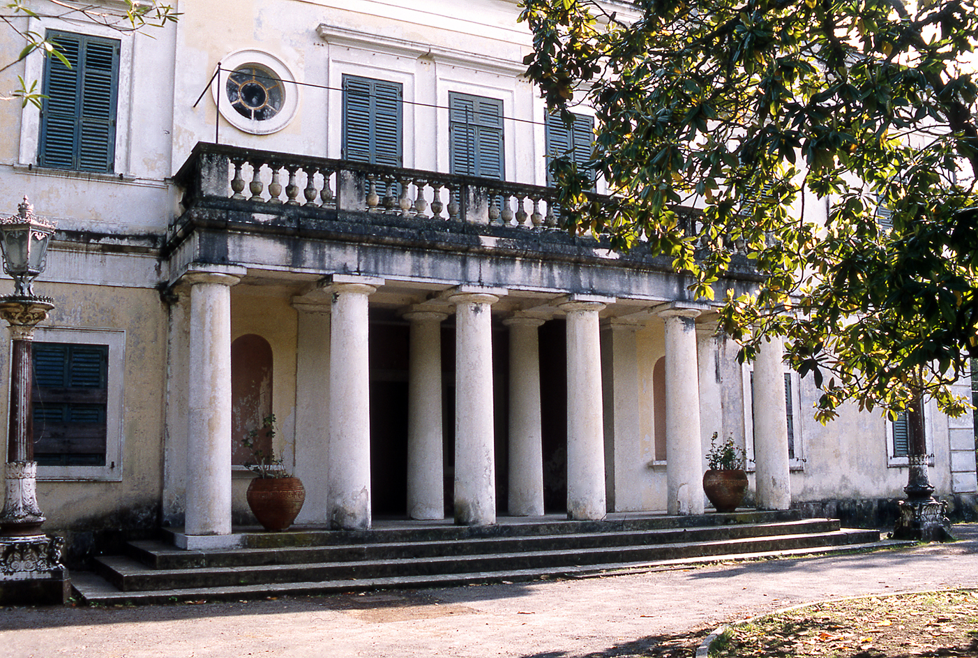 Palatsi ja ympäröivä valtava puisto ovat korkealla niemellä aivan kaupungissa kiinni. Ne kuuluivat sopimukseen, jolla kuningas aikoinaan hyvitti Kreikan valtiota miljoonien dollarien maksamattomista veroista. Palatsi rakennettiin vuonna 1831 Englannin suurlähettiläälle. Itävalta-Unkarin nuori keisarinna, Elizabeth (Sissi) vietti siellä kesää 1860, ihastui Korfuun ikihyviksi ja rakennutti myöhemmin itselleen 10 kilometrin päähän Akilleuksen palatsin.