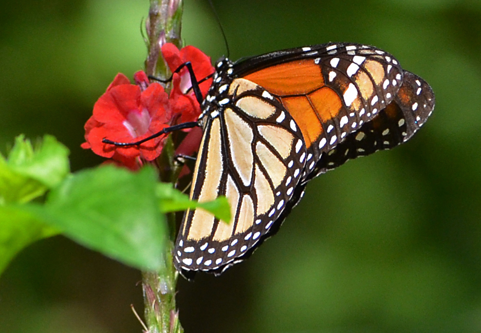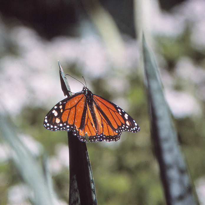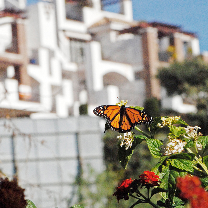 Lehdon laidalla juoksee kuivuuttaan pölisevä uoma, jonka reunoilla ryöppyävät bougainvillat, hibiscukset, pelargoniat, kaktusten valjut kukat. Mistä ne saavat vetensä? Kullanruskea liikahdus oleanteriaidassa saa pumpun kiihtymään arveluttavasti. Monarkkiperhonen!