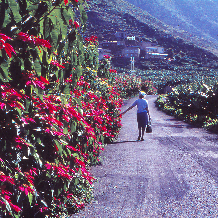Mutta yllätykset eivät lopu tähän. Kun ryhdyn vanhoja kaivelemaan, käteen osuu myös dioja vanhempieni Kanarian matkalta 1966. Isä harrasti hieman valokuvausta ja tuohon aikaan Las Palmasin reissussa oli aimo annos eksotiikkaa ja kuvattavaa. Sieltä löytyy kuva isästä pitelemässä monarkkia, joka on matkalla mercadosta ostettuun pieneen lasipulloon! Kuvan otti varmaan Heli-äiti. Siellä hän kävelee Gran Canarian menneessä maailmassa, jonne vyöryy joulutähtien huikea kukinta.