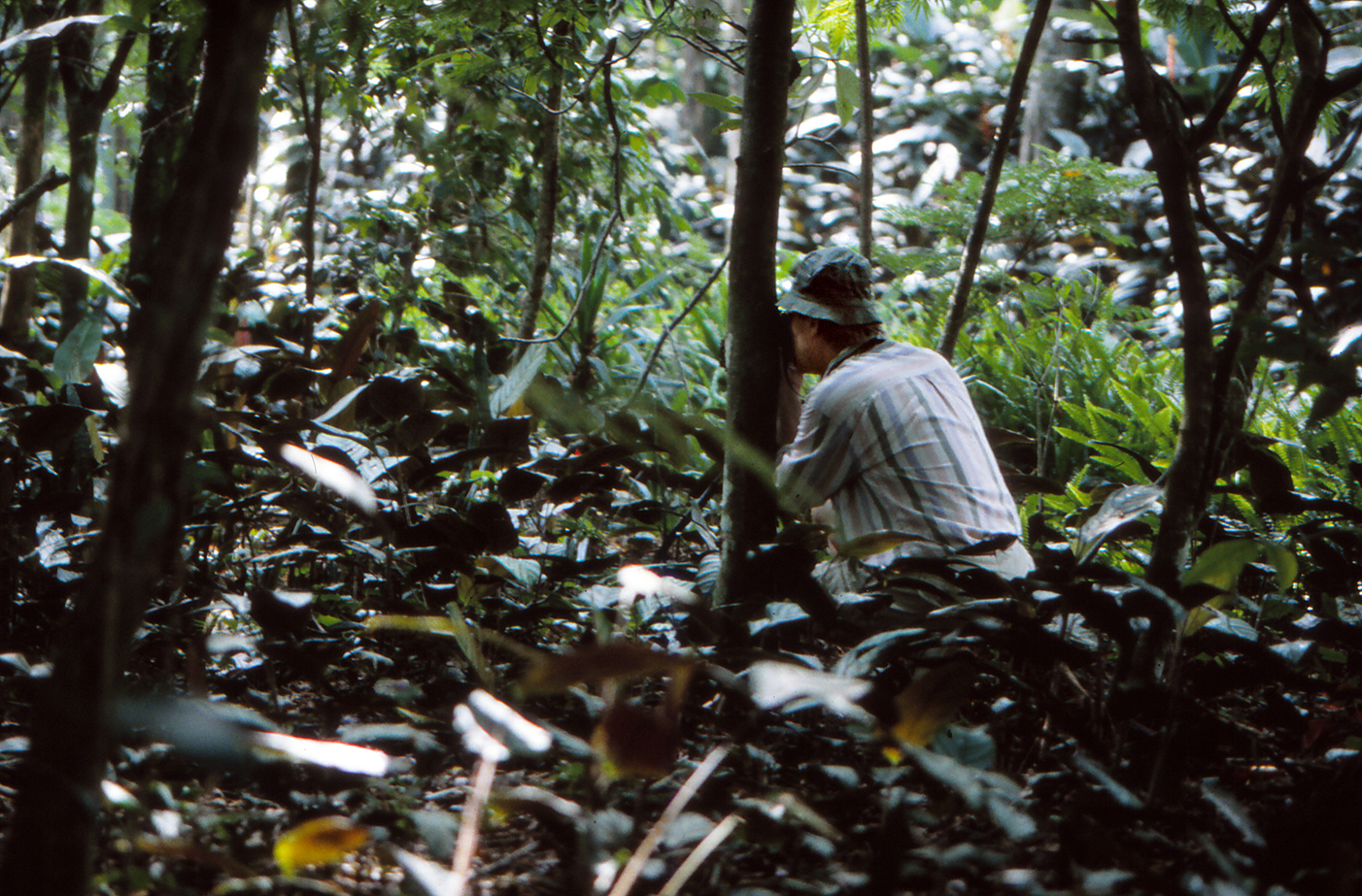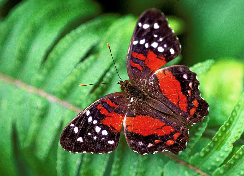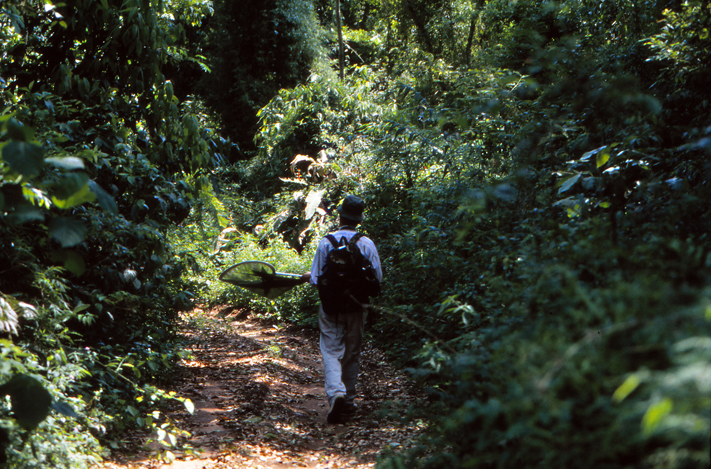 Polku haarautuu ja Hannu häviää jonnekin. Ratti huolestuu: ”All the paths look the same, you get lost very easily”. Huhuilemme Hannua, ja mies sukeltaa vähän ajan kuluttua vaatteet ja haavi täynnä piikkejä, okia ja liimamaisia siemeniä. Vaaleiden housujen polvet ovat tiilenpunaisessa lateriittisavessa, mies on likomärkä hiestä. ”Yritin ihmeellisen punaista perhosta, mutta morpho lensi haaviin”, Hannu huohottaa ja kaivaa repustaan vesipullon. Hän näki punanauhakapteenin (Anartia amathea), loisteliaan täpläperhosen. Miksi se pöyhkeilee tulenpunaisella puvullaan, vaikka koeolosuhteissa naaraat hyväksyvät mustankin koiraan? Sitä mietin, kun huomaan viereiseen kukkaan tehokkaasti naamioituneen vihreänvalkoisen rukoilijasirkan napanneen etujalkojen pihteihin samaisen amathean, jolta puuttuu pää.