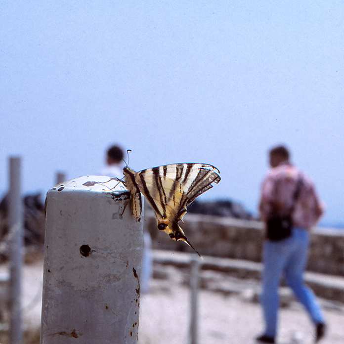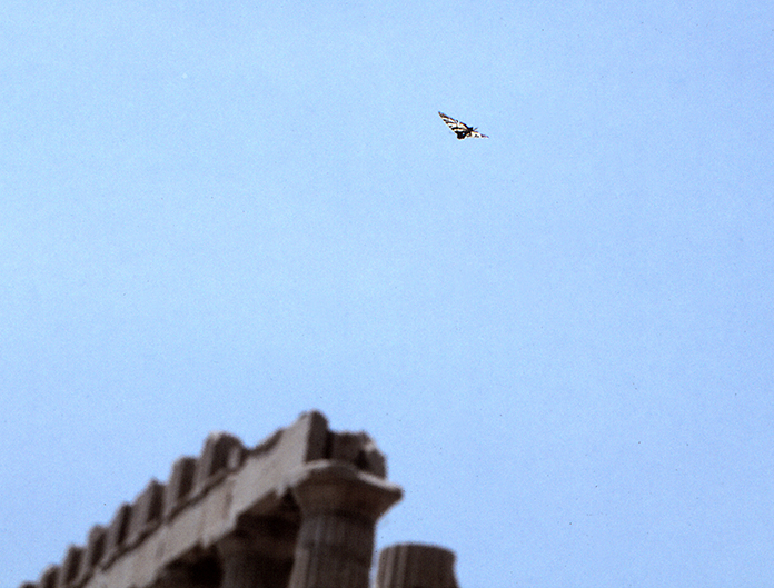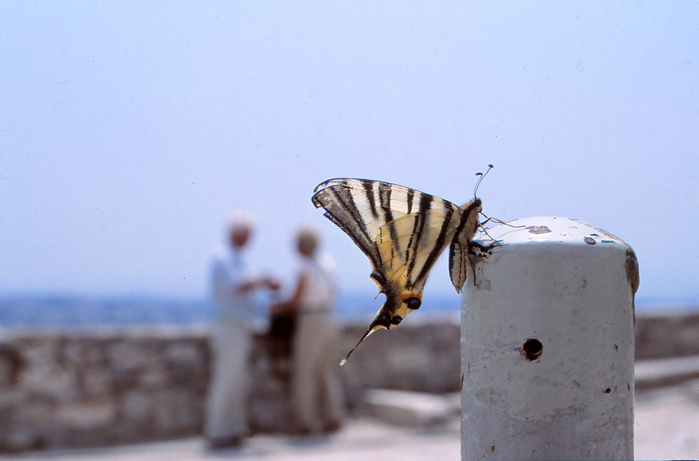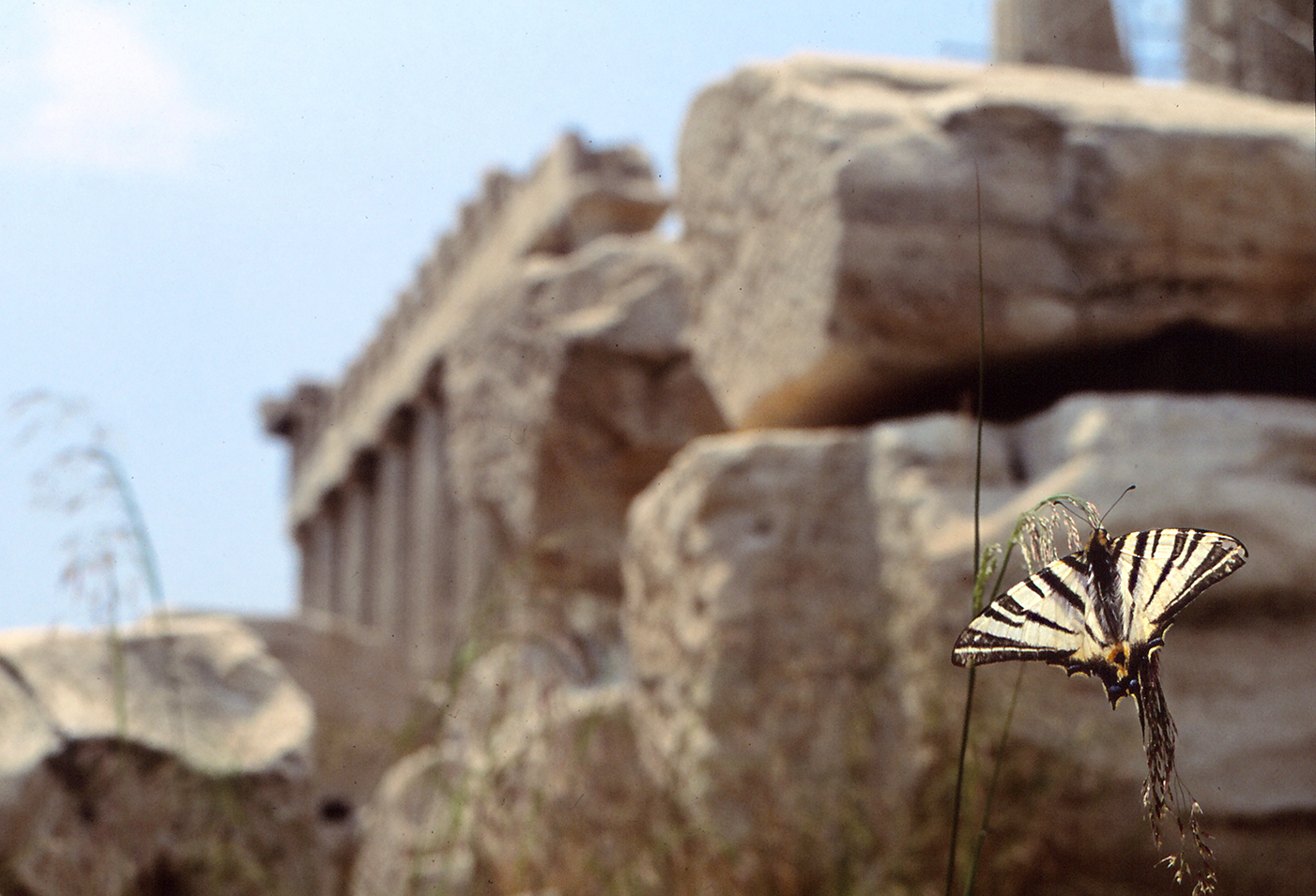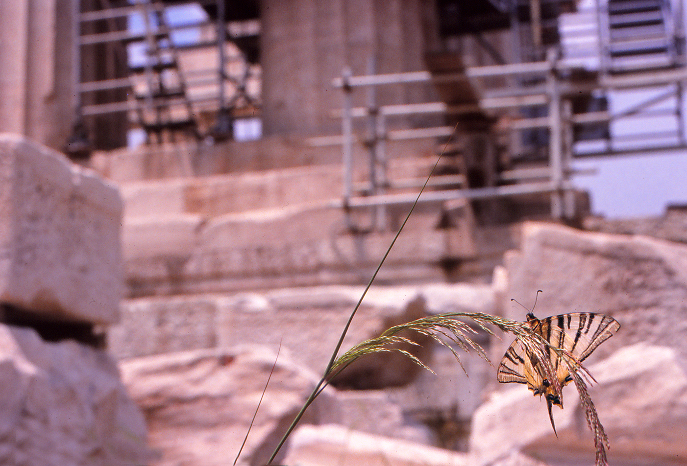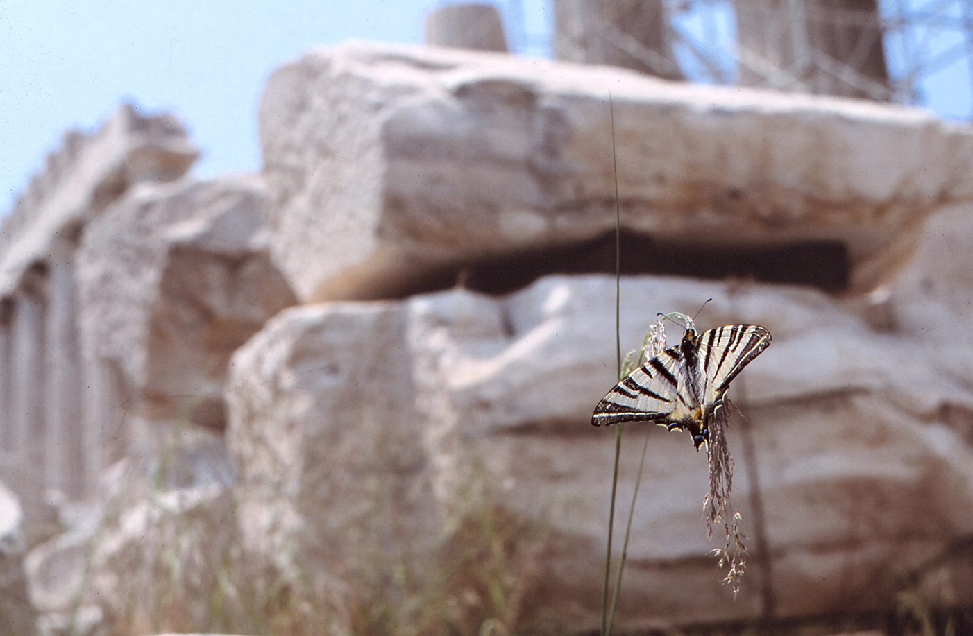 Kivisellä kukkulalla ei ole kasvillisuutta jotain heinää lukuun ottamatta. Täällä en odota tapaavani elävää luontoa, kun kaikki on tallattua. Vaan punaisen trukin nokalla lepää purjeritari (Iphiclides podalirius), lennähtää aitanaruja kannattelevan tolpan nokkaan, räpyttelee sikin sokin lojuvien marmorilohkareiden välisissä heinätupsuissa, ampaisee taivaisiin kohoaviin rakennustelineisiin, pyhään pylväikköön, putoaa leijana takaisin. Se ei ole muuttunut miksikään 2500 vuodessa; näki temppelin pystytyksen, näki sen raiskaukset ja toivorikkaat korjaukset, näkee sen lopullisen tuhon.