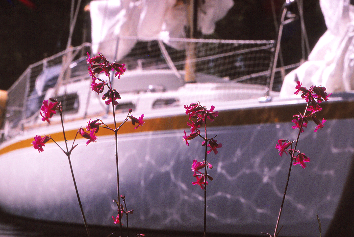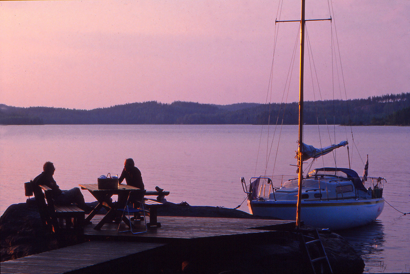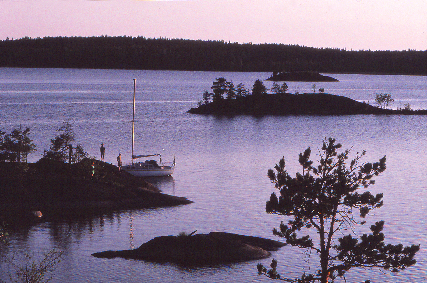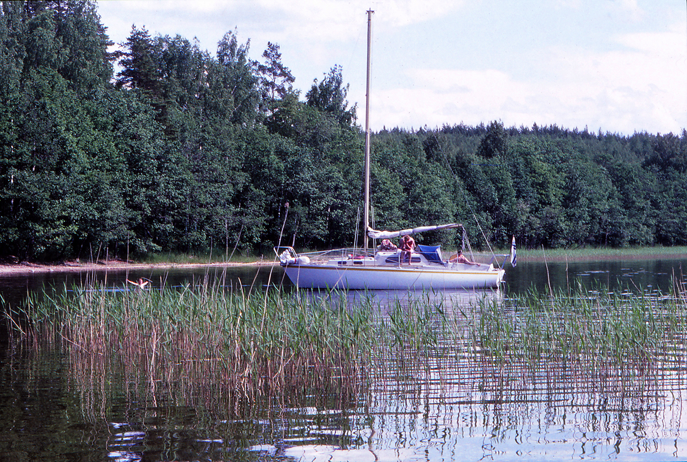 Muutaman tunnin mahtavan surfauksen jälkeen rätit alas ja peltispinnulla (lue 10 hevosvoiman dieseli) hiljakseen kivikkoiseen lahteen, jota tiheä ruovikko kaunistaa oikealta sivulta. Kiinnitämme veneen perän poijuun ja keulan vahvaan pollariin. Sauna lämpiämään ja eväät katokseen, tällä kertaa makkarat eivät ole unohtuneet, eikä olut.
