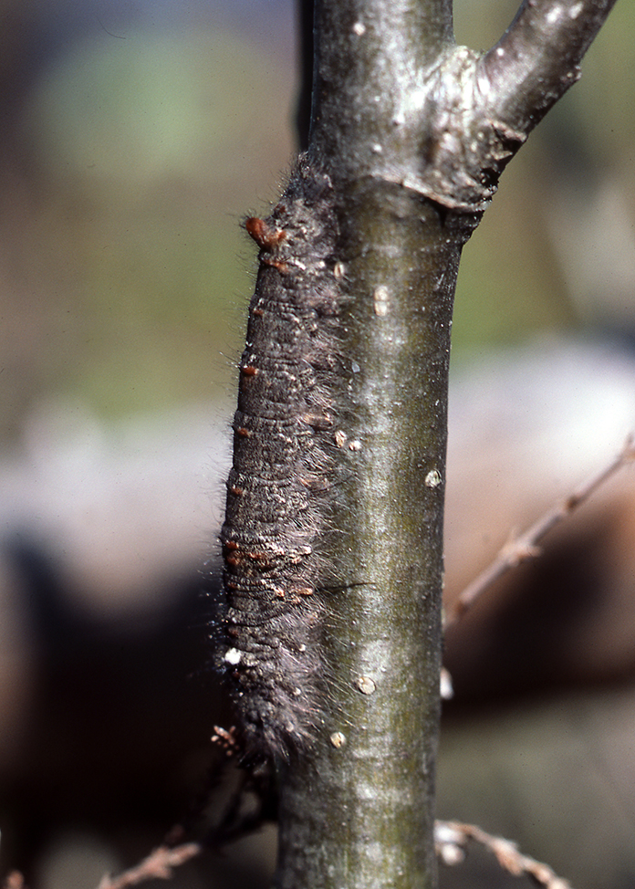 Mikä vaiva oli ylipäätään löytää tumman lehtikehrääjän (Gastropacha quercifolia) toukkia luonnosta. Tavoitin ne Saimaan suurinta selkää halkovalta Kyläniemeltä, hakkuuaukiolta, ison kiven juurelta. Toukat olivat vielä pieniä, tiiviisti kiinni pikkupihlajien rungoissa lähellä tyveä tai oksanhaarukkaa. Ensimmäistä en millään huomannut, vaikka kaveri osoitti sormella.
