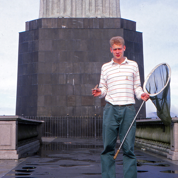 Mutta nyt valokuvaaja muistaa vähän väärin. Sain vihjeen kaikkien aikojen perhospyydyksestä ystävältäni Aarnion Hannulta, biologilta, jonka isä, rovasti Armo I. Aarnio oli parikymmentä vuotta aikaisemmin käynyt patsaalla samalla tavalla aamulla ja ihmetellyt silmät pyöreinä. Ottanut talteen poikaansa varten joitakin yksilöitä, joita Hannu vuosia myöhemmin oli kostutellut levitettäväksi. Trooppisen metsän jättimäisten kiitäjien siivet ulottuvat nyt melkein kokoelmalaatikon laidasta laitaan. Luutaharjajuttu oli tosi, senkin olin Hannulta kuullut.