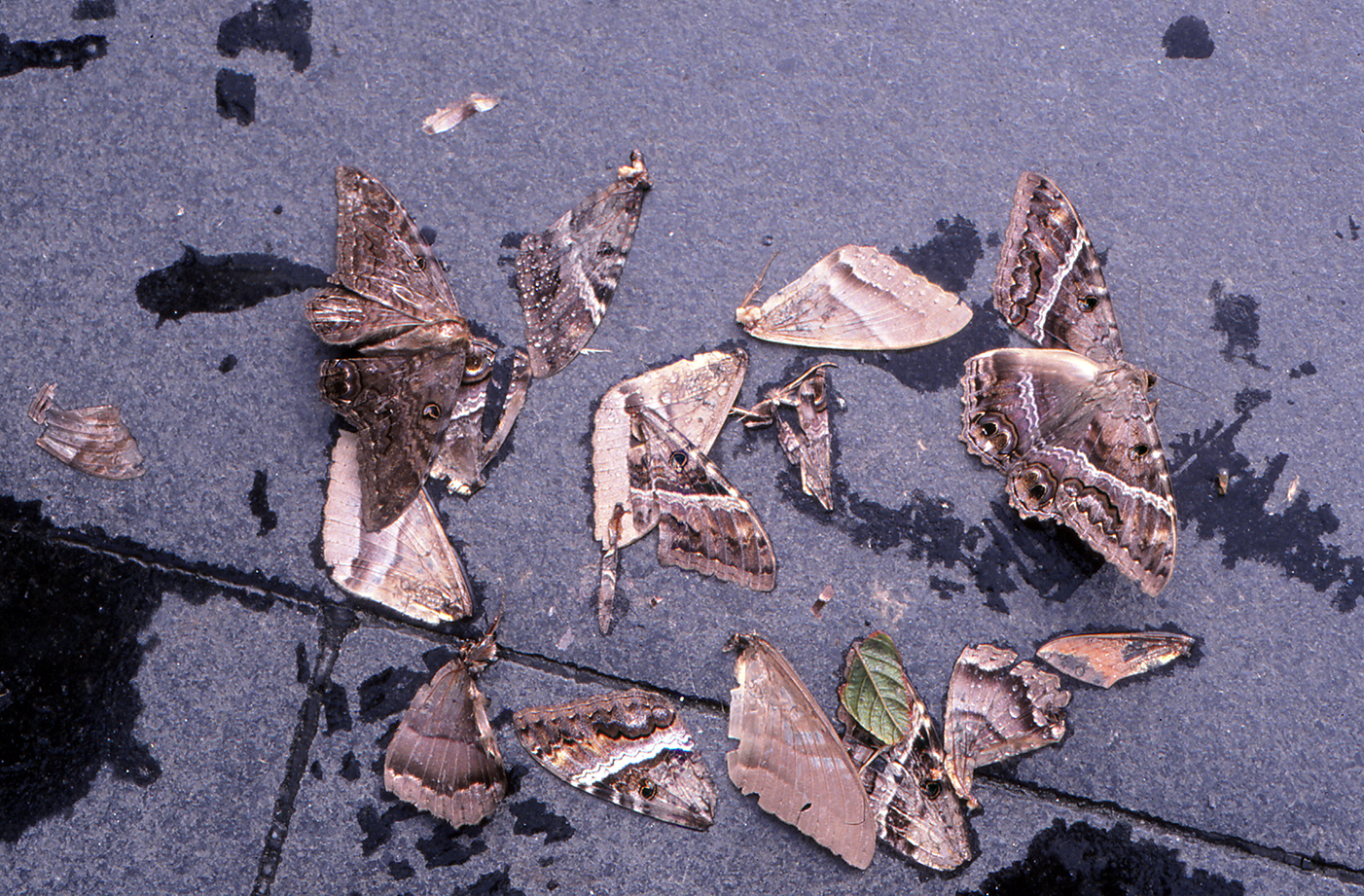 Jähmettyneet perhosryppäät reunustavat sammuneita valonheittimiä. Kivetyksellä on perhosten jäänteitä, siipiä, pitkiä hiusmaisia tuntosarvia, ruumiinosia. Siivet ovat liiskautuneet kiveen tai lepattavat kuin lehdet aamutuulessa. Hävittäjän näköisiä vihreitä ja mustankirjavia kiitäjiä. Rumia, melkein inhottavan näköisiä yökkösiä kuin lepakoita. Karvaisia kehrääjiä.
