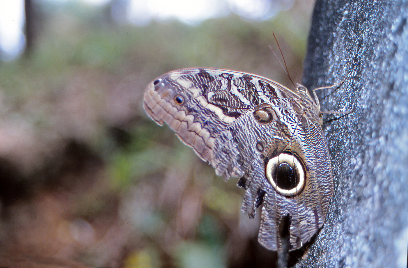 Totta tosiaan, lautasen kokoinen harmaankirjava yökkönen ja vieressä pikkuruinen kellanpunainen. Nyt sokeiden silmät avautuvat. ”Täällähän on perhosia joka paikassa, sä kävelet niiden päällä!” Mukana yksi puolihämärissä lentävä päiväperhonenkin, vyöpöllökäs (Caligo teucer). (Pikkukuva Kristuspatsaasta on netistä.)