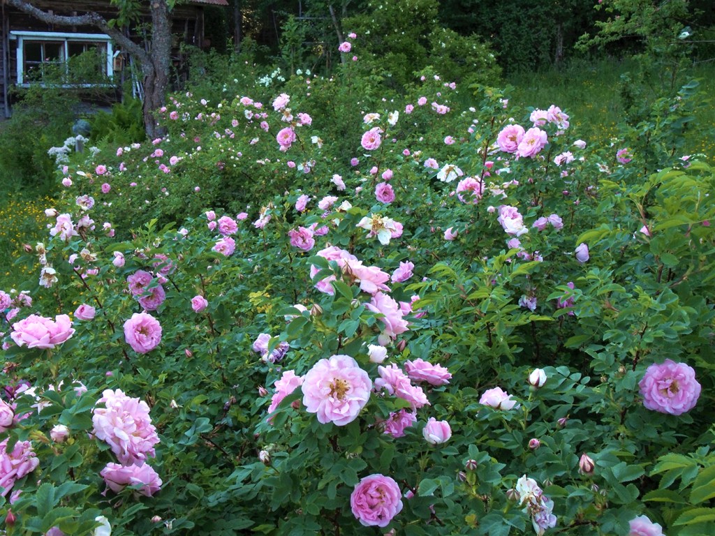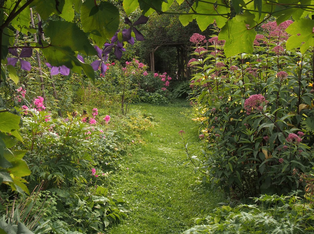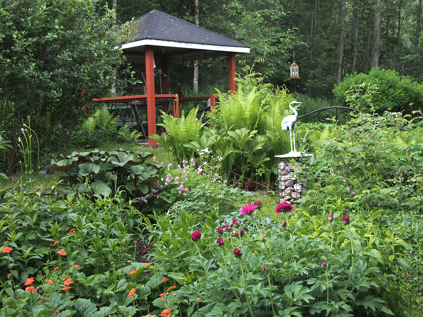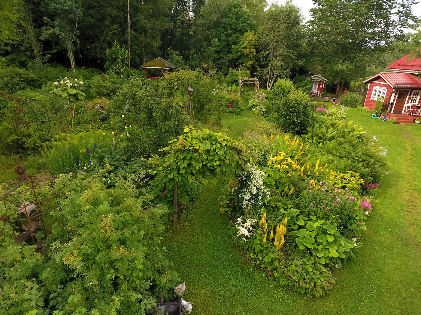 Juha Ahvonen kertoo puutarhan hoidosta. ”Keväisin katkomme edellisvuoden kuihtuneet kasvit perennojen juurille ravinteeksi. Joillekin vaativimmille lajeilla, kuten pioneille, jalo- ja köynnösruusuille sekä kärhöille annamme kompostoitunutta käymälätuotosta. Tuhkaa heittelemme kevättalven hangille. Perennapenkeistä poistamme välillä vuohenputkia, rönsyleinikkejä ja nokkosia. Muuten ne eivät paljon hoitoa tarvitse.