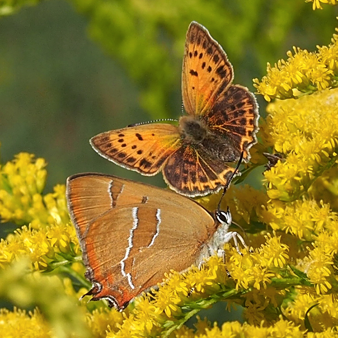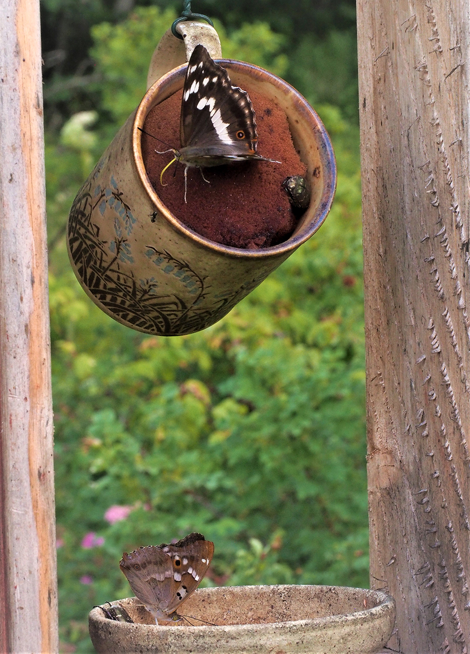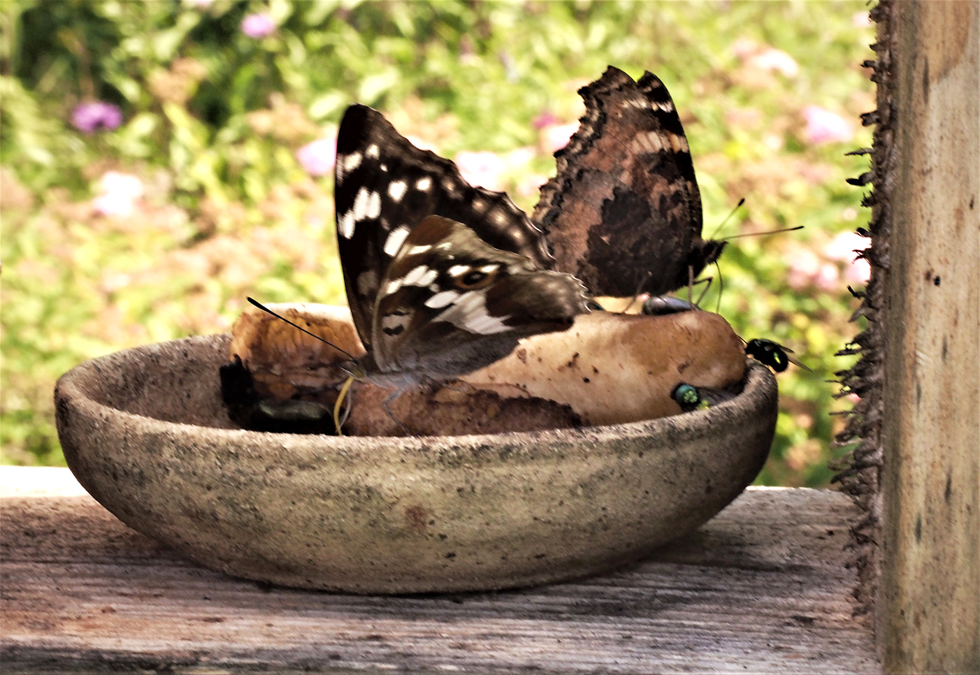 Kesän hienoimpia havaintoja ovat häiveperhonen (Apatura iris), joka säihkyy nauhuksen lehdellä ja pikkuhäiveperhonen (Apatura ilia), joka hakee omenapuun rungolta vuotavaa mahlaa. Häiveet ovat vasta viime vuosina löytäneet tiensä lounaiseen Suomeen, jonne ne ovat levinneet kaakosta. Ilmastonmuutosta lie sekin. Viimeisenä superkuva 19. päivänä heinäkuuta 2023, kun puutarhan baariin ovat istahtaneet niin häiveperhonen kuin pikkuhäiveperhonen! Taitavat olla naaraita kumpikin, vaikka yleensä baarissa koiraat kumoavat kuppia. Harvinainen osuma huipentaa puutarhan keskikesän!