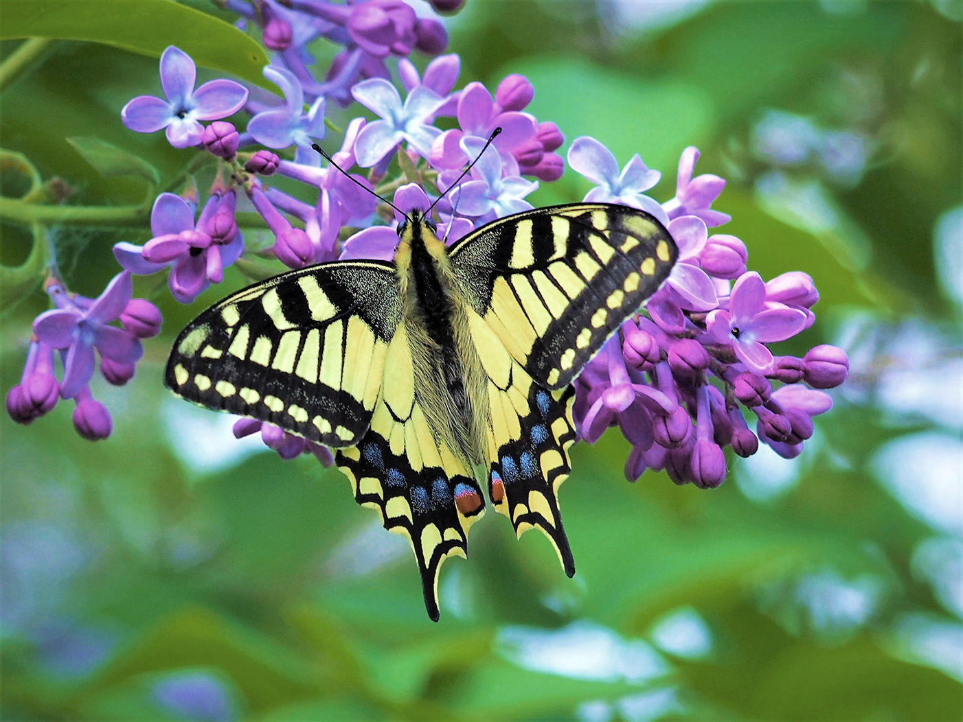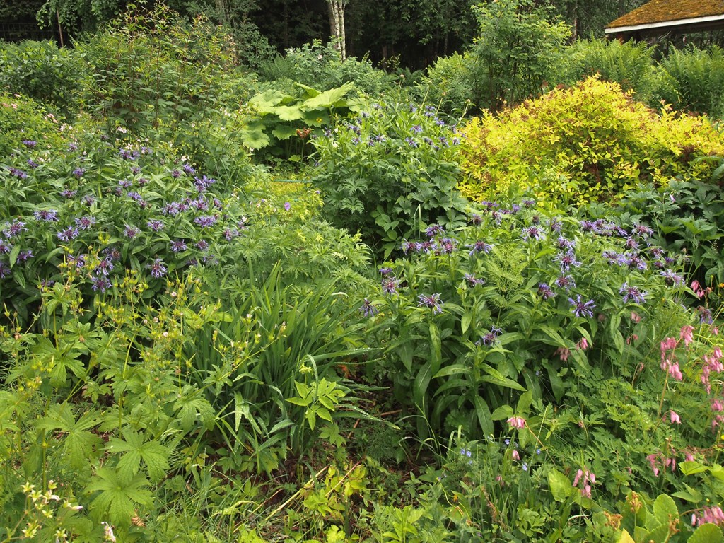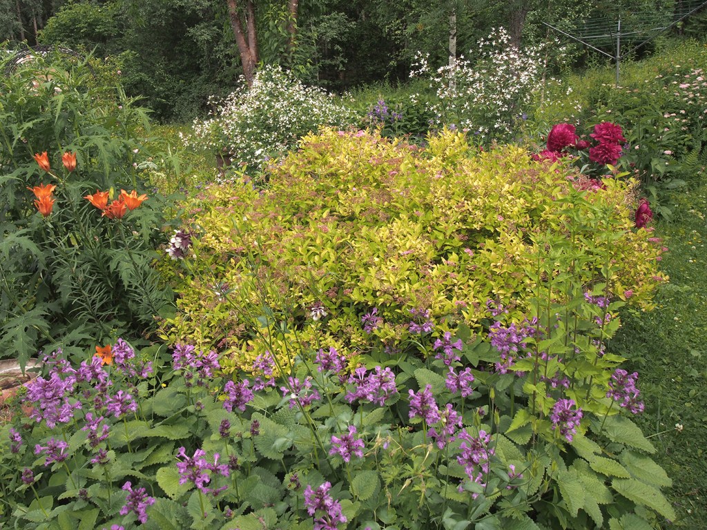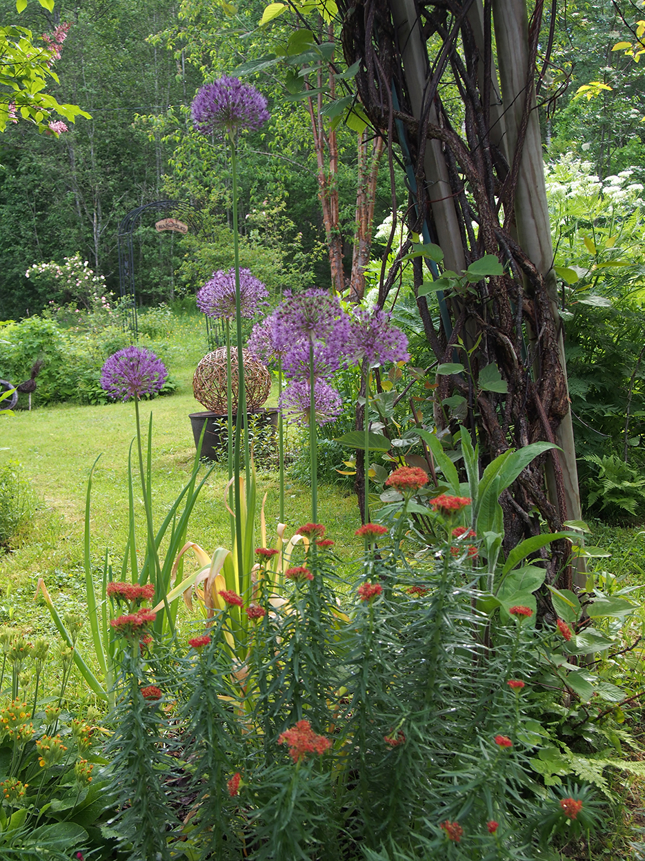 Juhannuksena puutarha alkaa olla parhaimmillaan. Alppiruusut kukkivat samoin kuin jättilaukat ja ruusujuuret. Kaksi kaunotarta, ritariperhonen ja syreeni kruunaavat näkymän. Seurana vielä Suomusjärvellä harvinainen virnasinisiipi metsäkurjenpolvella.