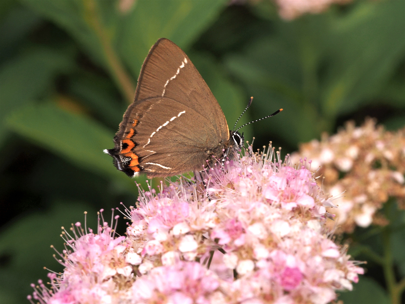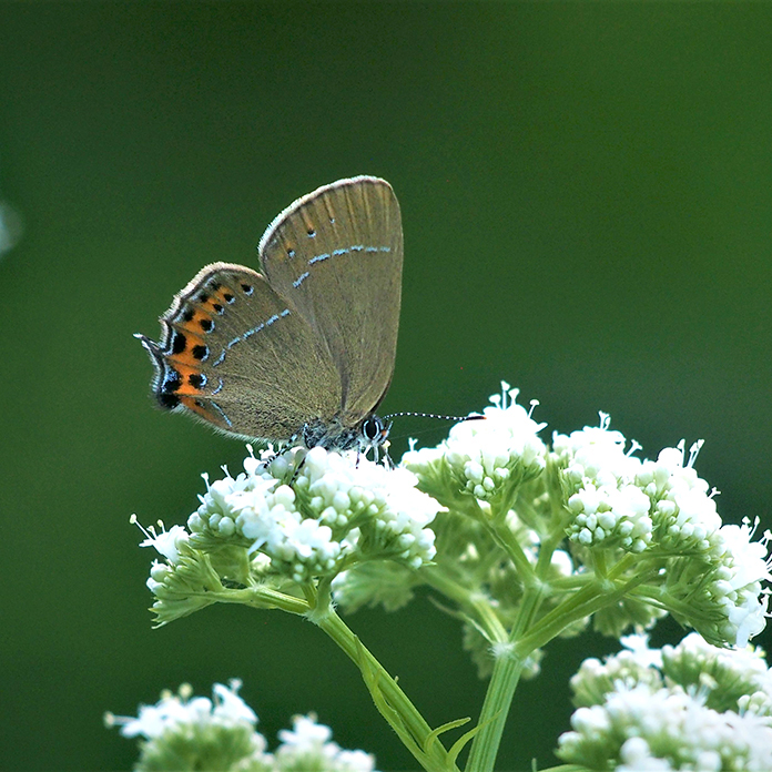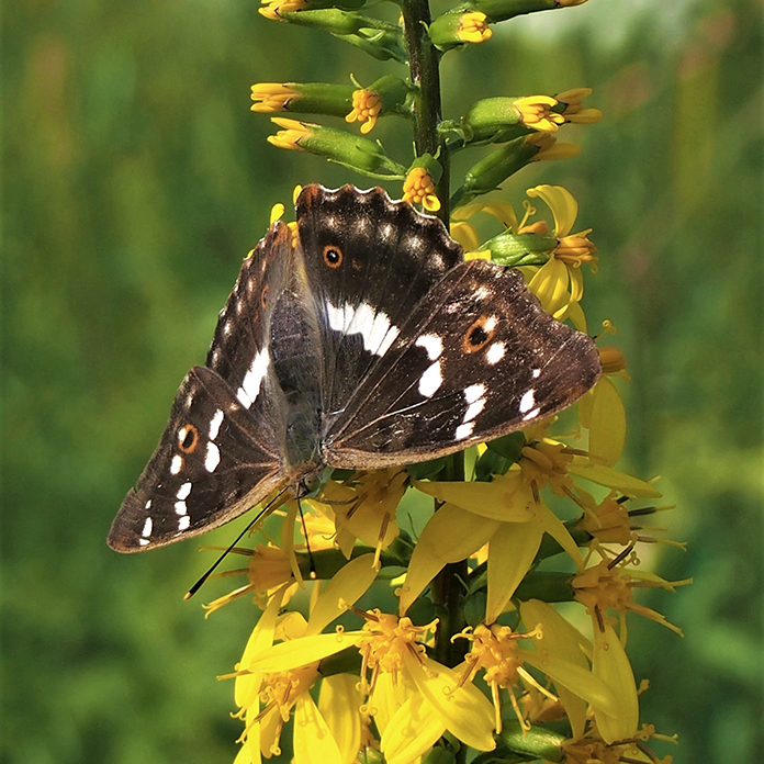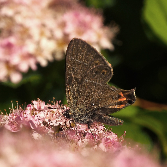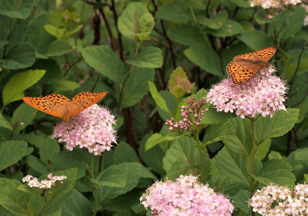 Kesäkuun lopulla puutarhaan ehtii ilmaantua ruusulla kääntelevä tuominopsasiipi ja toinen rohtovirmajuurelle. Onpa siellä myös niittysinisiipi, hopeasinisiipi keltamaitteella, niittyhopeatäplä valkolehdokilla ja idänniittyperhonen juomassa kissankellon vesipisaroita. Kun kesäkuu kääntyy heinäkuulle, ponnahtavat keisarinviitta ja ketohopeatäplä parhaalle perhoskukalle eli ruusuangervolle. Nyt 2023 puutarhassa on havaittu 58 lajia, kun viimeisin tulokas, juolukkasinisiipi lasketaan mukaan!