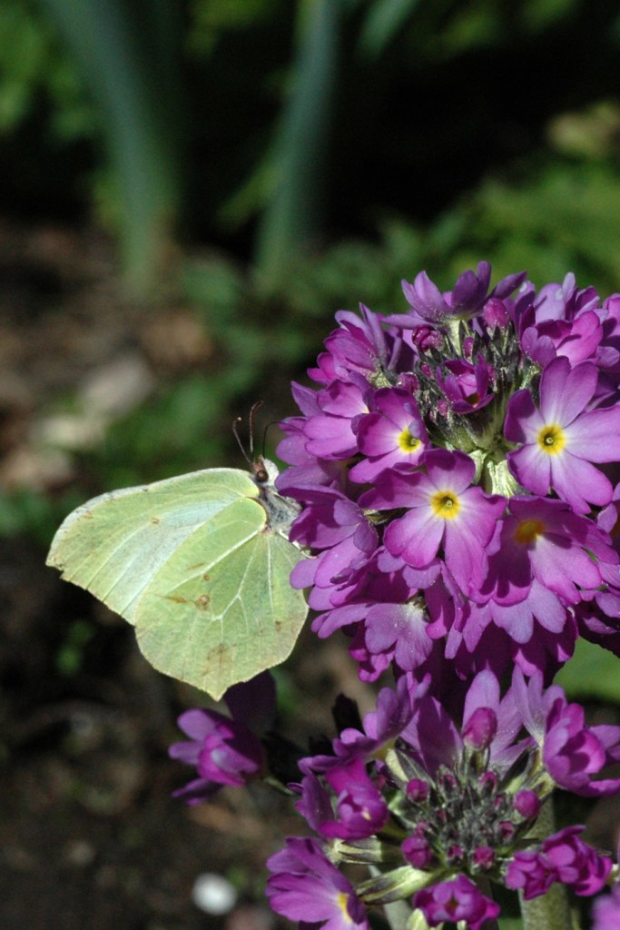 Jos puutarhan koristekasvien lisäksi lähistöllä on tarjolla kukkivia luonnonkasveja, lisää se perhosten laji- ja lukumäärää. Vasemmalla sitruunaperhosia auringontähdillä, oikealla aurora metsäorvokeilla.