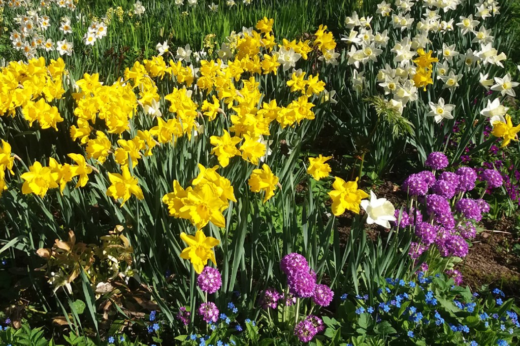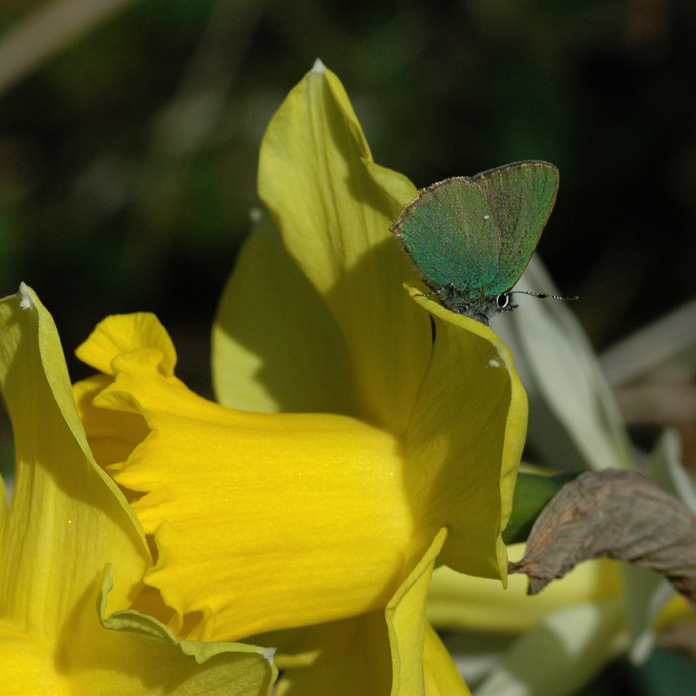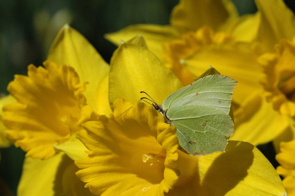 Keväisen puutarhan näyttävimpiä kukkakasveja ovat erilaiset narsissit. Ne eivät ole erityisen hyviä mesikasveja, mutta monet kevään perhosista lepäilevät mielellään suurilla ja värikkäillä kukilla. Alla vasemmalla kangasperhonen, oikealla sitruunaperhonen