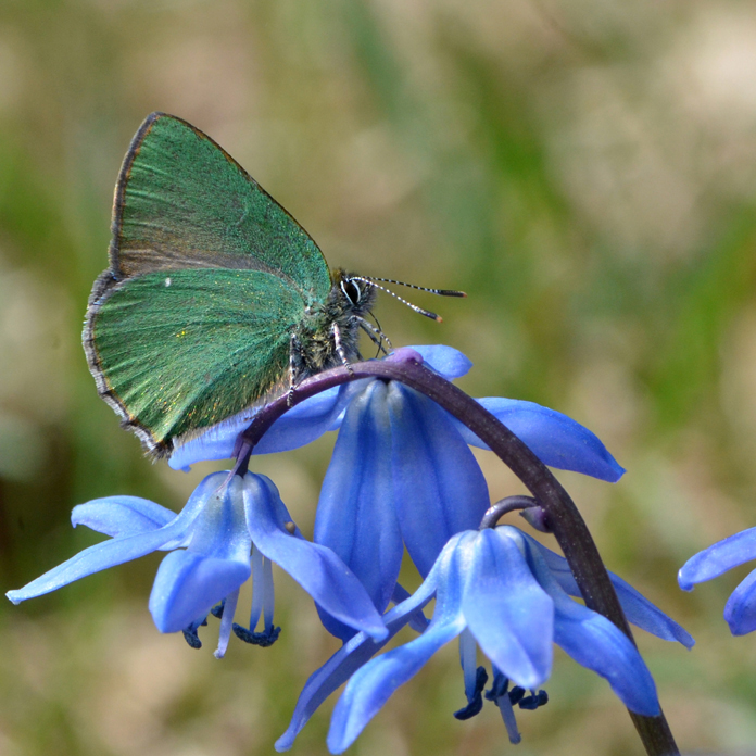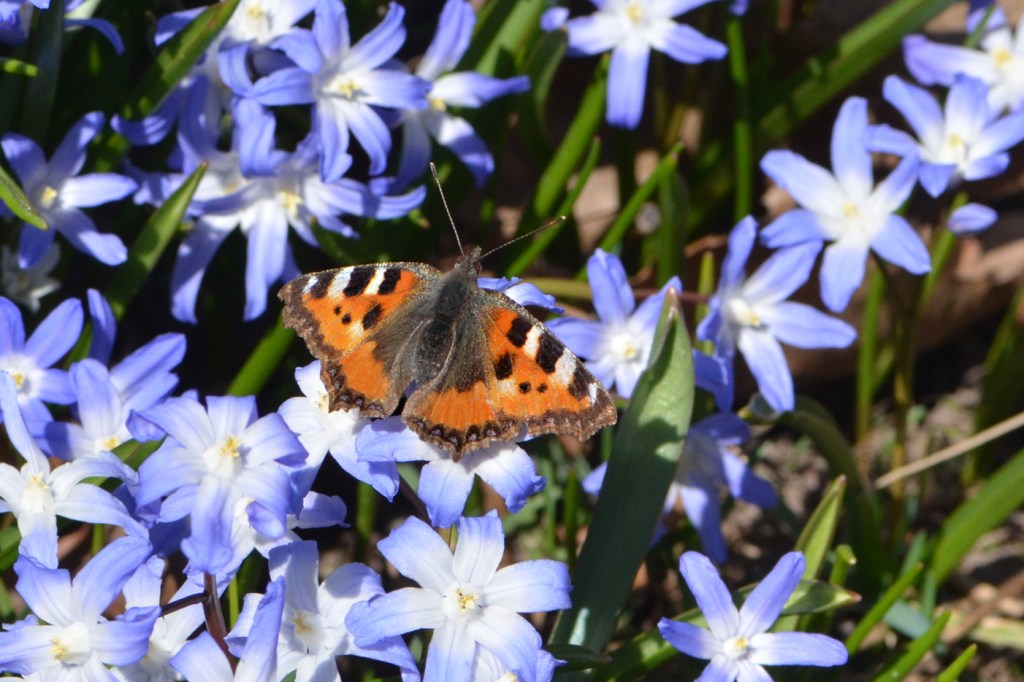Idänsinililja (Scilla) on saanut vieraakseen kangasperhosen (vas.), kevättähti (Chionodoxa) nokkosperhosen