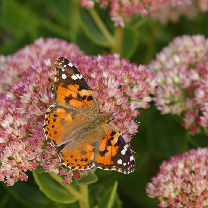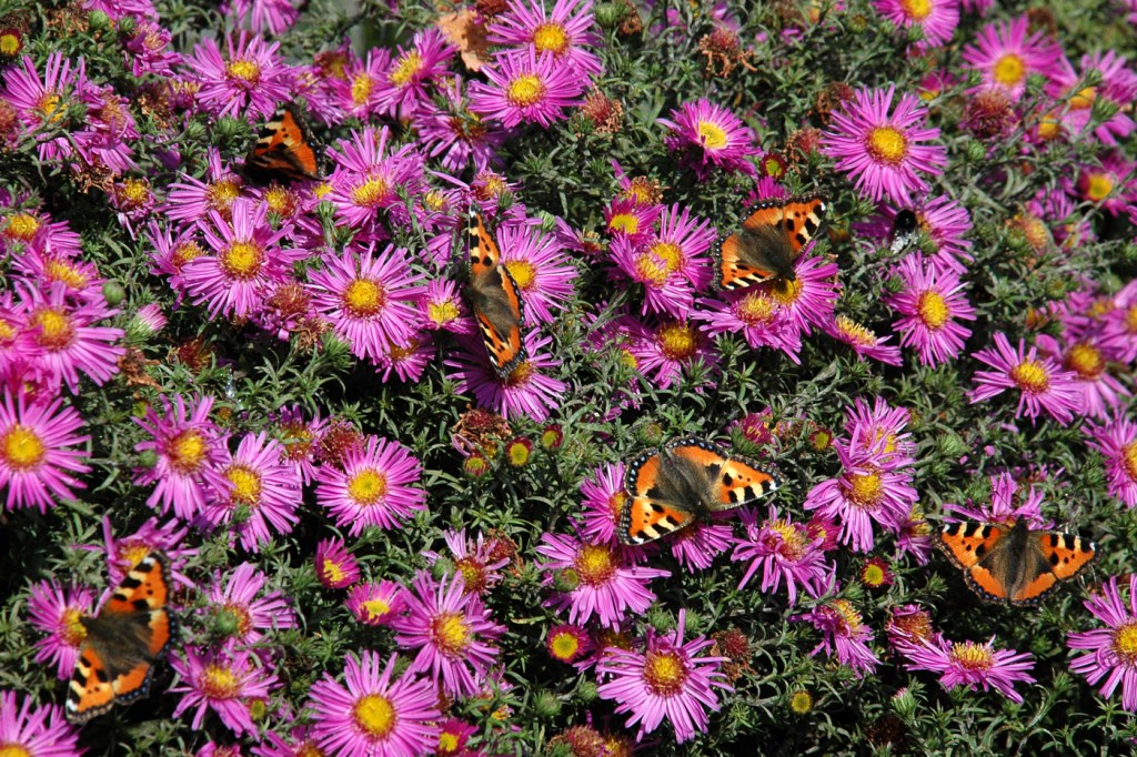 Nokkosperhosia syysasterilla (Aster), ohdakeperhonen syysmaksaruoholla (Sedum spectabile)