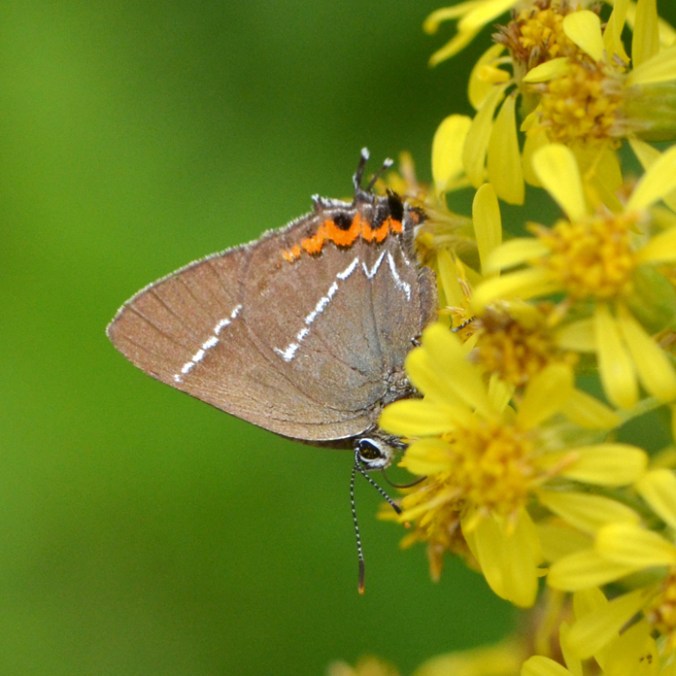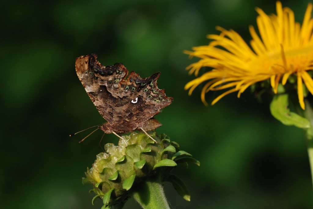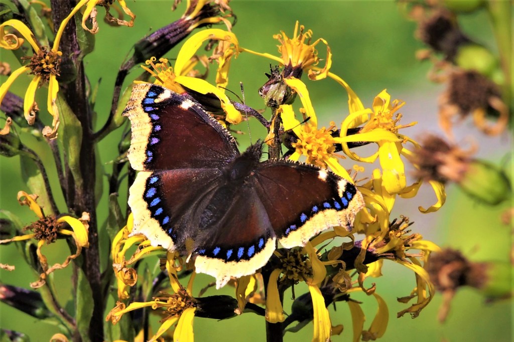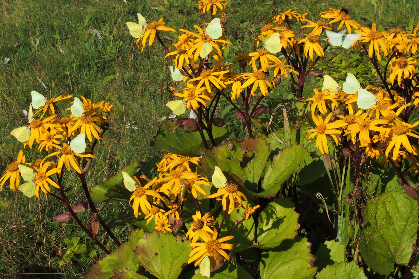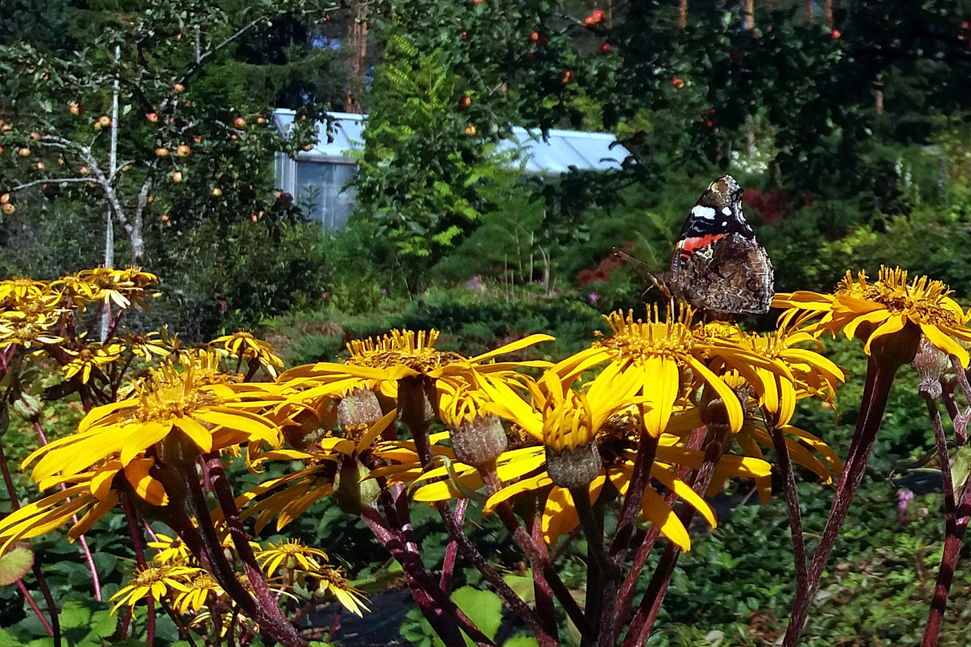 Erilajiset nauhukset (Ligularia) ovat loppukesän perhosmagneetteja. Alakuvassa kallionauhuksella kymmenittäin sitruunaperhosia, ylhäällä amiraali. Oikealla keskellä harvinainen jalavanopsasiipi