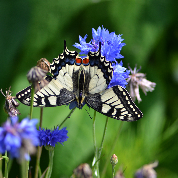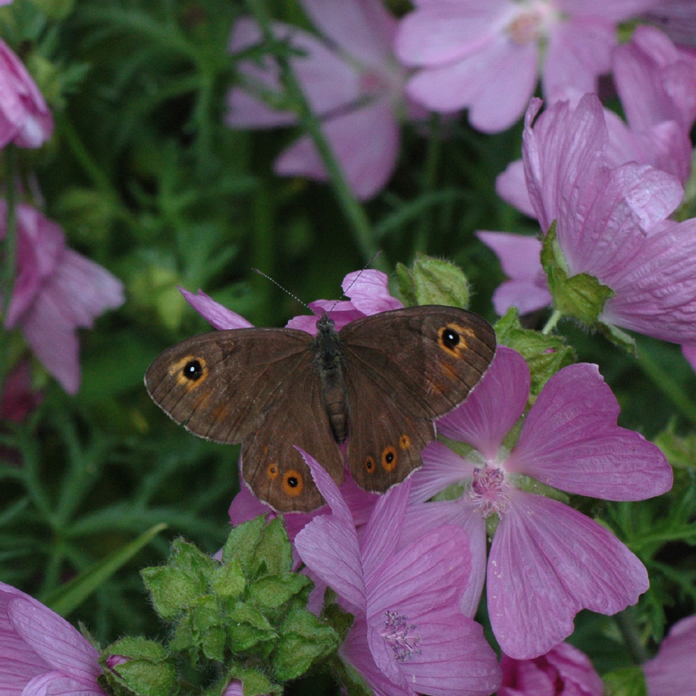 Metsän reunaan perustetun puutarhan koristekasvit saattavat vetää puoleensa perhosia jotka normaalisti kuuluvat metsälajistoon. Kuvassa tummapapurikko myskimalvan (Malva moschata) kukilla
