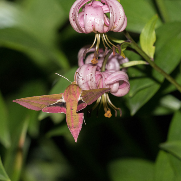 Kiitäjäperhoset työntävät pitkän imutorvensa kukan mesilähteeseen räpyttämällä paikallaan ilmassa. Kuvassa hormakiitäjä varjoliljan kukalla