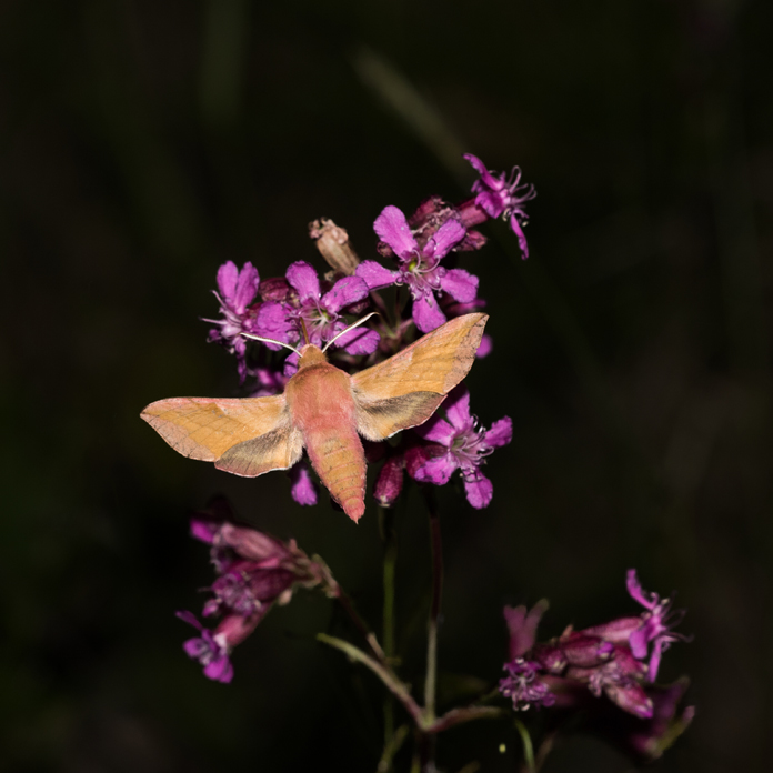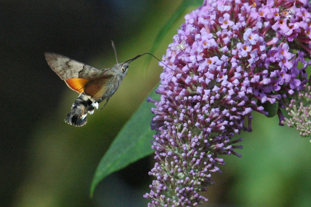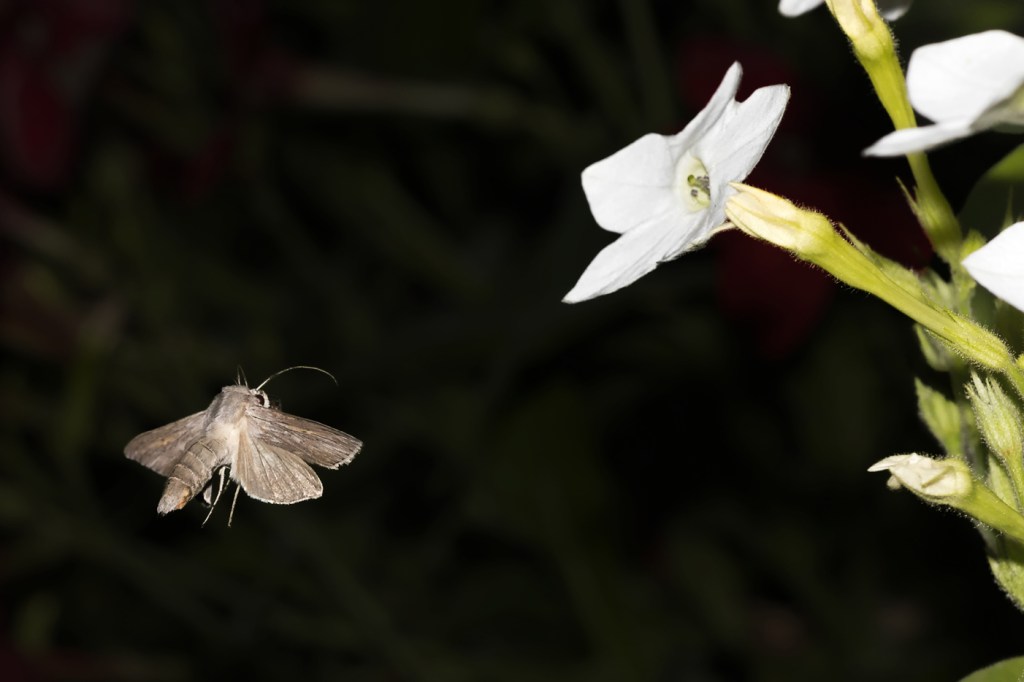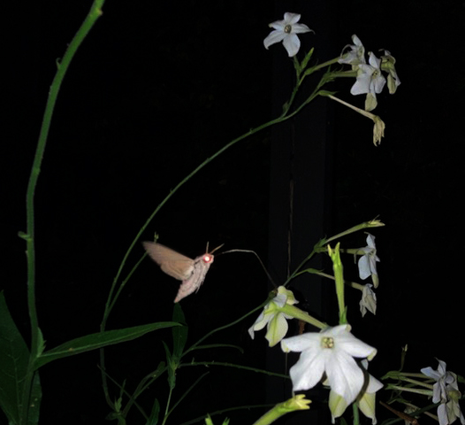 Suomessa harvinainen kiertokiitäjä käy mielellään koristetupakan kukilla (kuva: Leena Kotanen). Oikealla kaapuyökkönen