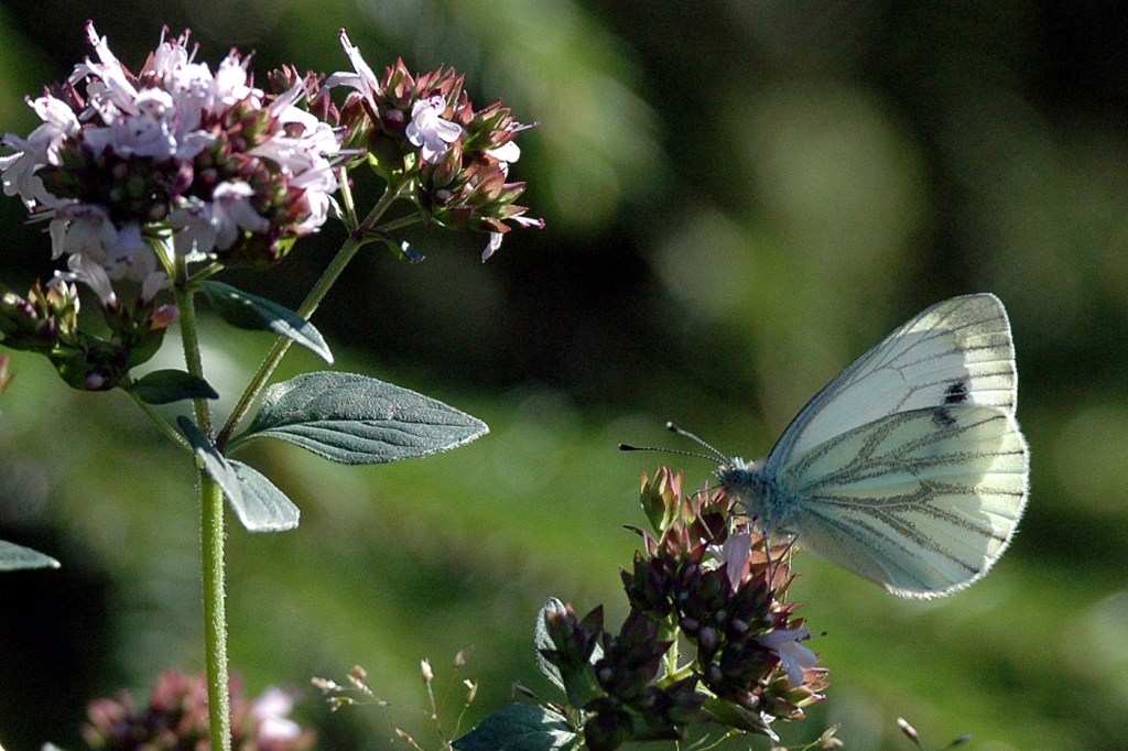 Lanttuperhonen mäkimeiramin (Origanum vulgare) kukinnolla, oikealla karttaperhonen